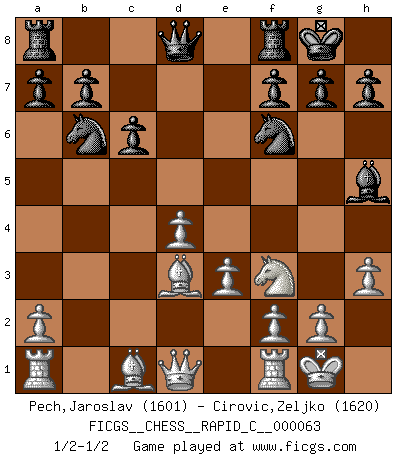 Last move : 1/2-1/2 2009 January 12 4:33:23 [Event "FICGS__CHESS__RAPID_C__000063"] [Site "FICGS"] [Date "2008.11.26"] [Round "1"] [White "Pech,Jaroslav"] [Black "Cirovic,Zeljko"] [Result "1/2-1/2"] [WhiteElo "1601"] [BlackElo "1620"] 1.d4 d5 2.c4 Nf6 3.Nc3 c6 4.e3 e6 5.Nf3 Bb4 6.Bd3 O-O 7.O-O Bxc3 8.bxc3 Nbd7 9.cxd5 exd5 10.c4 dxc4 11.Bxc4 Nb6 12.Bd3 Bg4 13.h3 Bh5 1/2-1/2 QGD : Marshall defense Kingside Castling by player Black (move 6) Kingside Castling by player White (move 7) This chess game ended in a draw. Follow this game move after move (download)During a Chess competition a Chessmaster should be a combination of a beast of prey and a monk. (Alexander Alekhine) Um dein Spiel zu verbessern musst du zuallererst das Endspiel studieren, denn diese kann unabhängig studiert werden. Die Eröffnung und das Mittelspiel müssen immer in Bezug gesetzt werden zum Endspiel. (José Raúl Capablanca) La última cosa en que Fischer estaba interesado era en tonterías, siempre y cuando el Ajedrez estuviera involucrado. (Elie Agur) La tactique est l'élément le plus important du milieu de jeu. (Siegbert Tarrasch) Locking firmely the window serves nothing, only small thiefs pass through there, the big thiefs enter through the front door. (Luc-Olivier Leclerc)