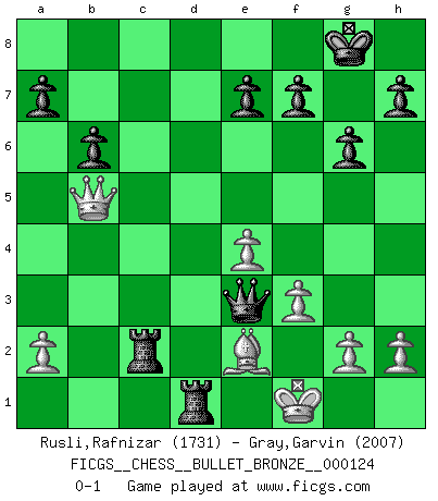 Last move : 0-1 2009 June 13 16:40:6 [Event "FICGS__CHESS__BULLET_BRONZE__000124"] [Site "FICGS"] [Date "2009.06.13"] [Round "1"] [White "Rusli,Rafnizar"] [Black "Gray,Garvin"] [Result "0-1"] [WhiteElo "1731"] [BlackElo "2007"] 1.d4 Nf6 2.c4 g6 3.Nc3 d5 4.cxd5 Nxd5 5.e4 Nxc3 6.bxc3 Bg7 7.Nf3 c5 8.Be2 O-O 9.O-O b6 10.Qa4 Bb7 11.Rd1 cxd4 12.Nxd4 Qc8 13.f3 Qxc3 14.Ba3 Bxd4+ 15.Qxd4 Qxa3 16.Rac1 Nc6 17.Qd7 Qe3+ 18.Kf1 Rac8 19.Qxb7 Nd4 20.Rxd4 Rxc1+ 21.Rd1 Rfc8 22.Qd7 R8c2 23.Qb5 Rxd1+ 0-1 King's Indian defense, 3.Nc3 Kingside Castling by player Black (move 8) Kingside Castling by player White (move 9) Player Black won this chess game. Follow this game move after move (download)The tactician knows what to do when there is something to do; whereas the strategian knows what to do when there is nothing to do. (Gerald Abrahams) Schach verlangt totale Konzentration. (Robert James Fischer) En el Ajedrez, tal como es jugado por los Maestros, practicamente la suerte es eliminada. (Emanuel Lasker) Ne tendez aucun piège pour le plaisir ! Ne jouez rien dans l'espoir que l'adversaire réagisse de façon stupide ! Prenez toujours pour acquis que l'adversaire va trouver le meilleur coup ! Ne jouez jamais de coup dans l'espoir que l'adversaire ne voie pas la menace ! Chacun de vos coups doit améliorer la position d'une façon ou d'une autre. If you are going through hell, keep going. (Winston Churchill)