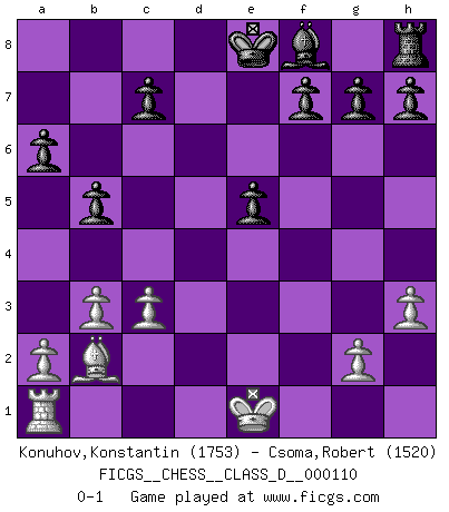 Last move : 0-1 2009 April 12 2:37:25 [Event "FICGS__CHESS__CLASS_D__000110"] [Site "FICGS"] [Date "2008.11.27"] [Round "1"] [White "Konuhov,Konstantin"] [Black "Csoma,Robert"] [Result "0-1"] [WhiteElo "1753"] [BlackElo "1520"] 1.e4 d6 2.d4 Nf6 3.Nc3 a6 4.f4 b5 5.e5 dxe5 6.fxe5 Nd5 7.Nxd5 Qxd5 8.b3 Nc6 9.Nf3 Bg4 10.c3 Rd8 11.h3 Bf5 12.Bd3 Bxd3 13.Qxd3 Nxe5 14.Nxe5 Qxe5+ 15.dxe5 Rxd3 16.Bb2 Re3+ 17.Kd1 Rxe5 18.Re1 Rxe1+ 19.Kxe1 e5 0-1 This chess game has been lost on time (started : 2008.11.27 4:27:13) Pirc defense Player Black won this chess game. Follow this game move after move (download)I play correspondence chess because it is both art and science while chess is art only. (A player at FICGS) Die Jungen erwarten, dass Opa einfach umfällt. Dann aber kann Opa fünf Stunden lang Schach spielen und die jungen Gegner an die Wand drücken. (Viktor Kortschnoi) Estaba muy claro de que el punto vulnerable del Gran Maestro Americano (Bobby Fischer) radicaba en las posiciones de doble filo, colgantes, irracionales, donde el siempre falló en encontrar un triunfo aún en una posición de clara victoria. (Efim Geller) Il vaut toujours mieux jouer un plan faux de façon logique que de n'avoir pas de plan du tout. (Victor Kortchnoï) Creativity involves breaking out of established patterns in order to look at things in a different way. (Edward De Bono)