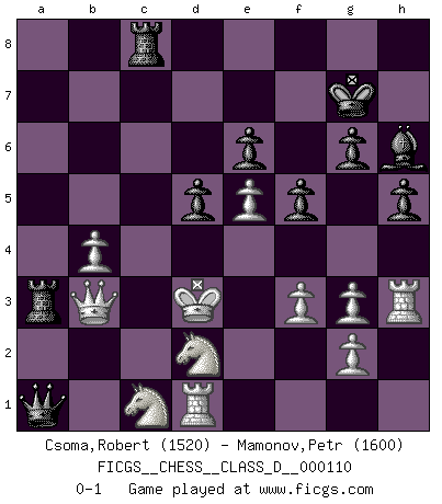 Last move : 0-1 2009 July 7 22:1:40 [Event "FICGS__CHESS__CLASS_D__000110"] [Site "FICGS"] [Date "2008.11.27"] [Round "1"] [White "Csoma,Robert"] [Black "Mamonov,Petr"] [Result "0-1"] [WhiteElo "1520"] [BlackElo "1600"] 1.d4 d5 2.Bf4 Nf6 3.Nf3 g6 4.e3 Bg7 5.Be2 Nh5 6.Bg3 Nxg3 7.hxg3 Nc6 8.Nc3 h5 9.Qd2 Bf5 10.Bd3 Bxd3 11.Qxd3 a6 12.O-O-O b5 13.Ne2 b4 14.e4 O-O 15.e5 e6 16.Nh2 f5 17.Nf4 Bh6 18.Kb1 Kf7 19.Nf3 a5 20.Nd2 a4 21.f3 Qe7 22.Ne2 Kg7 23.Rh3 b3 24.cxb3 Nb4 25.Qc3 a3 26.Nc1 axb2 27.Qxb2 c5 28.a3 Nc6 29.dxc5 Qxc5 30.b4 Qa7 31.Ka2 Qa4 32.Qb3 Nxb4+ 33.Kb2 Qa5 34.axb4 Qa1+ 35.Kc2 Rfc8+ 36.Kd3 Ra3 0-1 Queen's pawn, Mason variation Queenside Castling by player White (move 12) Kingside Castling by player Black (move 14) Player Black won this chess game. Follow this game move after move (download)In order to improve your game, you must study the endgame before everything else, for whereas the endings can be studied and mastered by themselves, the middle game and the opening must be studied in relation to the endgame. (Jose Raul Capablanca) Fischer: 'Remis!?' Uhlmann: 'Aber es muss doch dreimal Zugwiederholung sein!' Fischer: 'Sie nehmen das Remis an, wie ich es sage, sonst spiele ich weiter und werde Sie dann schlagen!' (Robert James Fischer) Bobby es el jugador de Ajedrez mas fino que este país jamás haya producido. Su memoria para las movidas, su brillantez en soñar combinaciones y su feróz determinación por la victoria son algo extraño. (John Collins) Mais l'homme est une créature légère et illogique : semblable au joueur d'échecs, il n'aime que le processus du but à atteindre, non le but lui-même. (Dostoïevsky) Hold em is to stud what chess is to checkers. (Johnny Moss)