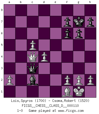Last move : 1-0 2009 March 20 19:43:52 [Event "FICGS__CHESS__CLASS_D__000110"] [Site "FICGS"] [Date "2008.11.27"] [Round "1"] [White "Lois,Spyros"] [Black "Csoma,Robert"] [Result "1-0"] [WhiteElo "1700"] [BlackElo "1520"] 1.e4 d6 2.d4 Nf6 3.Nc3 a6 4.Bc4 b5 5.Bd3 Bb7 6.Nf3 b4 7.e5 bxc3 8.exf6 exf6 9.bxc3 Be7 10.Rb1 Bc6 11.O-O Nd7 12.Re1 O-O 13.Nh4 g6 14.Qg4 Kh8 15.Nf5 Re8 16.Nh6 Kg7 17.c4 Rb8 18.Rxb8 Nxb8 19.Nf5+ Kh8 20.Nh6 Kg7 21.Nf5+ Kh8 22.Rxe7 Rxe7 23.Nxe7 Qxe7 24.Qc8+ Qe8 25.Qxc7 Qe1+ 26.Bf1 Qxc1 27.Qxb8+ Kg7 28.Qxd6 Be4 29.Qxa6 Bxc2 30.c5 Qd2 31.Qe2 Qc3 32.Qc4 1-0 Pirc defense Kingside Castling by player White (move 11) Kingside Castling by player Black (move 12) Player White won this chess game. Follow this game move after move (download)I am still a victim of Chess. It has all the beauty of art and much more. It cannot be commercialized. Chess is much purer than art in its social position. (Marcel Duchamp) Ich glaube, ich kenne inzwischen die Gründe für mein Versagen: schachliche Charakterfehler. Ich war nie ein Wunderkind und in meiner gesamten menschlichen Entwicklung immer zu langsam. (Viktor Kortschnoi) Creo que una cierta cantidad de temperamento es esperada de los genios del Ajedrez. (Ron Gross) La victoire dans une partie d'Echecs appartient la plupart du temps à celui qui voit un peu plus loin que l'adversaire. (Lasker) For a mechanic, you seem to do an excessive amount of thinking. (C-3PO in Star Wars ep.2)