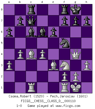 Last move : 1-0 2009 May 7 22:0:3 [Event "FICGS__CHESS__CLASS_D__000110"] [Site "FICGS"] [Date "2008.11.27"] [Round "1"] [White "Csoma,Robert"] [Black "Pech,Jaroslav"] [Result "1-0"] [WhiteElo "1520"] [BlackElo "1601"] 1.d4 Nf6 2.c4 e6 3.Nc3 Bb4 4.Qc2 O-O 5.Nf3 c5 6.e3 cxd4 7.exd4 d5 8.Bd3 dxc4 9.Bxc4 Nc6 10.Be3 Bd7 11.a3 Bd6 12.O-O Rc8 13.Qd3 a6 14.b4 Qc7 15.Ne4 Nxe4 16.Qxe4 Ne7 17.Rac1 Bc6 18.Qg4 Nf5 19.h3 1-0 This chess game has been lost on time (started : 2008.11.27 4:27:13) Nimzo-Indian : Classical variation Kingside Castling by player Black (move 4) Kingside Castling by player White (move 12) Player White won this chess game. Follow this game move after move (download)Fischer sacrificed virtually everything most of us weakies (to use his term) value, respect, and cherish, for the sake of an artful, often beautiful board game, for the ambivalent privilege of being its greatest master. (Paul Kollar) Mit sehr nachdenklichem Gesicht schreitet Bobby durch den Turniersaal. Was ist passiert?, fragt Lombardy. Ich stehe schlecht, antwortet Fischer. Lombardy: Dann biete doch einfach Remis an. Fischer: So schlecht stehe ich nun auch wieder nicht! (Robert James Fischer) Tu sabes, camarada Pachman, no disfruto el ser un Ministro, preferería jugar al Ajedrez como tu. (Che Guevara) Avec des compensations pour le matériel en plus... (Anonyme) A person who never made a mistake never tried anything new. (Albert Einstein)
