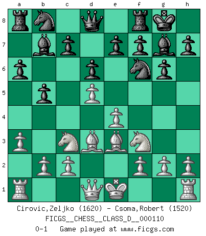 Last move : 0-1 2009 January 4 22:21:26 [Event "FICGS__CHESS__CLASS_D__000110"] [Site "FICGS"] [Date "2008.11.27"] [Round "1"] [White "Cirovic,Zeljko"] [Black "Csoma,Robert"] [Result "0-1"] [WhiteElo "1620"] [BlackElo "1520"] 1.e4 d6 2.d4 Nf6 3.Nc3 a6 4.Nf3 b5 5.a3 Bb7 6.d5 g6 7.Bd3 Bg7 8.Be3 O-O 0-1 Pirc defense Kingside Castling by player Black (move 8) Player Black won this chess game. Follow this game move after move (download)A player surprised is half beaten. (Proverb) Jeder Schachmeister war einmal ein Anfänger. (Irving Chernev) Una de estas pequeñas movidas modestas pudieran ser mas molestas a tu oponente que la amenaza mas grande. (Siegbert Tarrasch) L'action d'une oeuvre littéraire se déroule sur un champ de bataille. Les masques et les types du drame moderne correspondent aux pièces du jeu d'échecs. L'intrigue correspond aux coups et aux gambits, c'est à dire aux techniques du jeu telles qu'utilisées et interprétées par les joueurs. Les tactiques et les péripéties [mouvements] correspondent aux coups exécutés par l'adversaire. (Viktor Shklovsky) A proverb is a short sentence based on long experience. (Miguel de Cervantes)