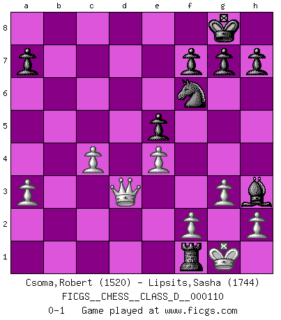 Last move : 0-1 2009 March 3 20:23:19 [Event "FICGS__CHESS__CLASS_D__000110"] [Site "FICGS"] [Date "2008.11.27"] [Round "1"] [White "Csoma,Robert"] [Black "Lipsits,Sasha"] [Result "0-1"] [WhiteElo "1520"] [BlackElo "1744"] 1.d4 Nf6 2.c4 e6 3.Nc3 Bb4 4.Qc2 O-O 5.Nf3 c5 6.g3 cxd4 7.Nxd4 d5 8.Bg2 e5 9.Nf3 d4 10.Bd2 dxc3 11.Bxc3 Bxc3+ 12.Qxc3 Qe7 13.O-O Nc6 14.Nd2 Bf5 15.e4 Be6 16.a3 Rfd8 17.b4 Rd4 18.b5 Rad8 19.bxc6 Rxd2 20.cxb7 Qxb7 21.Rab1 Qxb1 22.Rxb1 Rd1+ 23.Rxd1 Rxd1+ 24.Bf1 Bh3 25.Qd3 Rxf1+ 0-1 Nimzo-Indian : Classical variation Kingside Castling by player Black (move 4) Kingside Castling by player White (move 13) Player Black won this chess game. Follow this game move after move (download)Mistrust is the most necessary characteristic of the Chess player. (Siegbert Tarrasch) Es ist schade, dass viele Schachsportler vergessen, wie wichtig Auftreten und angemessene Kleidung sind. (Alexandra Kosteniuk) Prefiero perder una partida realmente buena, que ganar una mala. (David Levy) Vous n'êtes pas toujours obligé de jouer le meilleur coup. Un coup doit être actif, entreprenant, correct et beau ! (David Bronstein) All men can see these tactics whereby I conquer, but what none can see is the strategy out of which victory is evolved. (Sun Tzu)