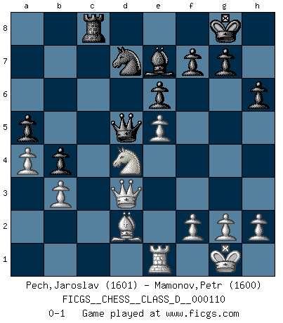 Last move : 0-1 2009 June 5 7:11:32 [Event "FICGS__CHESS__CLASS_D__000110"] [Site "FICGS"] [Date "2008.11.27"] [Round "1"] [White "Pech,Jaroslav"] [Black "Mamonov,Petr"] [Result "0-1"] [WhiteElo "1601"] [BlackElo "1600"] 1.d4 d5 2.c4 c6 3.Nf3 Nf6 4.Nc3 e6 5.e3 Nbd7 6.Bd3 dxc4 7.Bxc4 b5 8.Bd3 a6 9.a4 b4 10.Ne4 Bb7 11.O-O Be7 12.Nxf6+ Bxf6 13.Be4 Qc7 14.Qc2 c5 15.Bd2 Rc8 16.Rac1 a5 17.b3 Qb6 18.Rfe1 h6 19.Bxb7 Qxb7 20.Qd3 O-O 21.e4 cxd4 22.e5 Be7 23.Rxc8 Rxc8 24.Nxd4 Qd5 0-1 This chess game has been lost on time (started : 2008.11.27 4:27:13) QGD Slav : 4.Nc3 Kingside Castling by player White (move 11) Kingside Castling by player Black (move 20) Player Black won this chess game. Follow this game move after move (download)The most powerful weapon in Chess is to have the next move. (David Bronstein) Ich bin es gewohnt, das die Jugend mir überhaupt keinen Respekt entgegenbringt. (Alexander Morozewich) La estratégia requiere pensar, la táctica requiere observación. (Max Euwe) Même si vous avez un bon coup à faire, regardez toujours s'il n'y en a pas un qui lui soit préférable. (Pedro Damiano) Children in the dark cause accidents, accidents in the dark cause children. (Unknown)