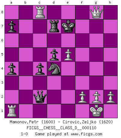 Last move : 1-0 2008 December 17 18:2:53 [Event "FICGS__CHESS__CLASS_D__000110"] [Site "FICGS"] [Date "2008.11.27"] [Round "1"] [White "Mamonov,Petr"] [Black "Cirovic,Zeljko"] [Result "1-0"] [WhiteElo "1600"] [BlackElo "1620"] 1.e4 e6 2.d4 d5 3.Nc3 Bb4 4.e5 Bxc3+ 5.bxc3 c5 6.Qg4 Ne7 7.Qxg7 Rg8 8.Qxh7 Nbc6 9.Nf3 Bd7 10.Bd2 c4 11.Ng5 Rf8 12.Be2 Qa5 13.Nxf7 Rxf7 14.Bh5 O-O-O 15.Bxf7 b5 16.O-O Nf5 17.a4 bxa4 18.Rfb1 Ncxd4 19.cxd4 Qxd2 20.Bxe6 Qxc2 21.Rb5 Nxd4 22.Bxd7+ Rxd7 23.Rc5+ Kd8 24.Qg8+ Ke7 25.Rc8 1-0 French : Winawer, Advance variation Queenside Castling by player Black (move 14) Kingside Castling by player White (move 16) Player White won this chess game. Follow this game move after move (download)Chess is a terrific way for kids to build self image and self esteem. (Saudin Robovic) Wir können eben der zündenden Macht des Opfers nicht wiederstehen, denn die Begeisterung für das Opfer liegt in der Natur des Menschen. (Rudolf Spielmann) El Ajedrez es un juego terrible. Si no dominas el centro, tu oponente tiene una posición mas libre. Si tu tienes el centro, entonces realmente tienes algo de que preocuparte. (Siegbert Tarrasch) Demandez au pauvre Cg1 ce qu'il en pense. Eduard Gufeld à propos de la variante Saemisch de l'Est-Indienne. Life is like a game of cards: the hand you are dealt represents determinism; the way you play it is free will. (Jawaharlal Nehru)