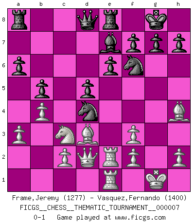 Last move : 0-1 2006 October 16 3:48:28 [Event "FICGS__CHESS__THEMATIC_TOURNAMENT__000007"] [Site "FICGS"] [Date "2006.08.21"] [Round "1"] [White "Frame,Jeremy"] [Black "Vasquez,Fernando"] [Result "0-1"] [WhiteElo "1277"] [BlackElo "1400"] 1.Nf3 Nf6 2.d4 Ng8 3.e4 Nf6 4.Nc3 Ng8 5.Bc4 d6 6.Bf4 e6 7.O-O Nf6 8.Qd2 Be7 9.Rfe1 O-O 10.e5 Nfd7 11.exd6 cxd6 12.Rad1 Re8 13.Bg3 Nf6 14.Re2 a6 15.Rde1 b5 16.Bd3 Bb7 17.a3 Bxf3 18.gxf3 d5 19.b4 Nc6 20.Bh4 Nxd4 0-1 Reti Opening Kingside Castling by player White (move 7) Kingside Castling by player Black (move 9) Player Black won this chess game. Follow this game move after move (download)The game of chess is the touchstone of the intellect. (Goethe) Das Schach ist nichts für kleine Geister, es beansprucht einen vollen Mann, der sich nicht sklavisch an das Überlieferte hält, sondern selbständig die Tiefen des Spiels zu ergründen sucht. (Wilhelm Steinitz) El Ajedrez es un juego terrible. Si no dominas el centro, tu oponente tiene una posición mas libre. Si tu tienes el centro, entonces realmente tienes algo de que preocuparte. (Siegbert Tarrasch) La vie est comme un jeu d'échecs : nous esquissons un plan, mais celui-ci est tributaire de ce que daignent faire l'adversaire aux échecs et le destin dans la vie. (Arthur Schopenhauer) First of all, we have to go back to the classical time control. (Anatoly Karpov)