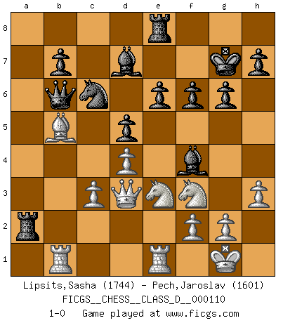 Last move : 1-0 2009 May 2 16:39:32 [Event "FICGS__CHESS__CLASS_D__000110"] [Site "FICGS"] [Date "2008.11.27"] [Round "1"] [White "Lipsits,Sasha"] [Black "Pech,Jaroslav"] [Result "1-0"] [WhiteElo "1744"] [BlackElo "1601"] 1.d4 Nf6 2.Bf4 d5 3.e3 g6 4.Nf3 Bg7 5.Bd3 O-O 6.O-O c5 7.Nbd2 Nc6 8.c3 c4 9.Bc2 Nh5 10.Qe2 Nxf4 11.exf4 Bd7 12.h3 Bh6 13.Qe3 Rc8 14.Ng5 e6 15.b3 cxb3 16.axb3 Re8 17.Ngf3 f6 18.b4 Qc7 19.Ba4 Bxf4 20.Qd3 a6 21.b5 axb5 22.Bxb5 Kg7 23.Rfe1 Qb6 24.Rab1 Ra8 25.Nf1 Ra2 26.Ne3 1-0 This chess game has been lost on time (started : 2008.11.27 4:27:13) Queen's pawn game Kingside Castling by player Black (move 5) Kingside Castling by player White (move 6) Player White won this chess game. Follow this game move after move (download)Checkers is for tramps. (Paul Morphy) Um sich vor der Gefahr einer Erkältung zu schützen, sorge der wanderlustige König beizeiten für ein brauchbares Versteck. (Aaron Nimzowitsch) ¿Cual es el objetivo de jugar una apertura de gambito?... Para adquirir una reputación de ser un jugador apuesto a costo de perder el juego. (Siegbert Tarrasch) Le système Elo représente seulement une moyenne. Il est simplement un indicateur de votre stabilité. (Anatoli Karpov) The quality of decision is like the well-timed swoop of a falcon which enables it to strike and destroy its victim. (Sun Tzu)