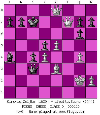 Last move : 1-0 2008 December 25 17:43:3 [Event "FICGS__CHESS__CLASS_D__000110"] [Site "FICGS"] [Date "2008.11.27"] [Round "1"] [White "Cirovic,Zeljko"] [Black "Lipsits,Sasha"] [Result "1-0"] [WhiteElo "1620"] [BlackElo "1744"] 1.e4 e6 2.d4 d5 3.Nc3 Bb4 4.e5 c5 5.a3 Bxc3+ 6.bxc3 Ne7 7.Nf3 Bd7 8.Be2 Ba4 9.O-O Qc7 10.Bd3 c4 11.Be2 O-O 12.Nh4 Nbc6 13.f4 Ng6 14.Nxg6 fxg6 15.Bd2 Ne7 16.Bg4 Nf5 17.Bxf5 Rxf5 18.g4 R5f8 19.Rf2 Qe7 20.Be3 Rf7 21.Qe2 Raf8 22.Raf1 Qxa3 23.f5 Qxc3 24.fxe6 Rxf2 25.Rxf2 Qa1+ 26.Kg2 Qa3 27.c3 Qxc3 28.Rxf8+ Kxf8 29.Qf3+ Ke8 30.Qf7+ Kd8 31.e7+ Kc7 32.e8Q 1-0 French : Winawer, Advance, positional Main line Kingside Castling by player White (move 9) Kingside Castling by player Black (move 11) Promotion Queen by player White (move 32) Player White won this chess game. Follow this game move after move (download)The most important feature of the Chess position is the activity of the pieces. This is absolutely fundamental in all phases of the game: Opening, Middlegame and especially Endgame. The primary constraint on a piece's activity is the Pawn structure. (Michael Stean) Wie kann ich Remis annehmen? Ich weiß ja gar nicht, wie ich stehe! (Fritz Sämisch) El Ajedrez es el juego mas altamente simbólico, pero las agresiones estan por lo tanto aún mas francamente representadas en la partida. Tal vez comenzo como un juego de guerra; Algo como la representación de una batalla en miniatura entre las fuerzas de dos reinos. (Karl Meninger) Il vaut toujours mieux jouer un plan faux de façon logique que de n'avoir pas de plan du tout. (Victor Kortchnoï) There is a computer disease that anybody who works with computers knows about. It's a very serious disease and it interferes completely with the work. The trouble with computers is that you 'play' with them ! (Richard P. Feynman)