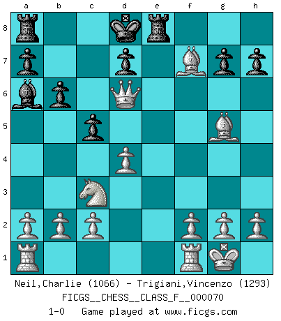 Last move : 1-0 2009 March 6 22:17:48 [Event "FICGS__CHESS__CLASS_F__000070"] [Site "FICGS"] [Date "2008.11.27"] [Round "1"] [White "Neil,Charlie"] [Black "Trigiani,Vincenzo"] [Result "1-0"] [WhiteElo "1066"] [BlackElo "1293"] 1.e4 e5 2.Nf3 Nf6 3.Nxe5 Nxe4 4.Qe2 Bc5 5.Qxe4 Nc6 6.Nxc6 Kf8 7.Nxd8 c6 8.Qf5 Ke7 9.Qxc5+ Ke8 10.Bc4 Kxd8 11.O-O b6 12.Qd6 c5 13.Nc3 Re8 14.d4 Bb7 15.Bxf7 Ba6 16.Bg5+ 1-0 This chess game has been lost on time (started : 2008.11.27 10:50:12) Petrov : Damiano variation Kingside Castling by player White (move 11) Player White won this chess game. Follow this game move after move (download)Chess, like love, is infectious at any age. (Flohr) Sie bekommen vielleicht den Eindruck, dass die Spitzenspieler überhaupt gar nicht so stark sind. Aber das stimmt nicht. Es ist eine Illusion. Mit einem Computer an der Seite ist es sehr leicht, Urteile zu fällen, aber wenn man alleine am Brett sitzt, sieht die Sache ganz anders aus. (Vladimir Kramnik) Bobby es el jugador de Ajedrez mas fino que este país jamás haya producido. Su memoria para las movidas, su brillantez en soñar combinaciones y su feróz determinación por la victoria son algo extraño. (John Collins) 'L'échange des dames est un coup dur pour les deux adversaires...' Un journaliste lors d'une partie du match Spassky-Fischer Watch your thoughts; they become words. Watch your words; they become actions. Watch your actions; they become habits. Watch your habits; they become character. Watch your character; it becomes your destiny. (Frank Outlaw)