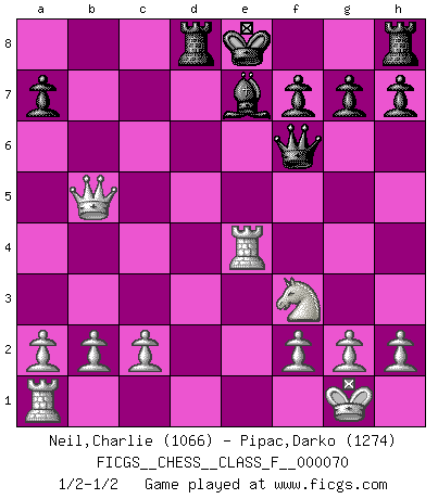 Last move : 1/2-1/2 2008 December 28 16:42:40 [Event "FICGS__CHESS__CLASS_F__000070"] [Site "FICGS"] [Date "2008.11.27"] [Round "1"] [White "Neil,Charlie"] [Black "Pipac,Darko"] [Result "1/2-1/2"] [WhiteElo "1066"] [BlackElo "1274"] 1.e4 e5 2.Nf3 Nc6 3.Bb5 d6 4.d4 Bg4 5.d5 Bd7 6.dxc6 Bxc6 7.Bxc6+ bxc6 8.O-O Nf6 9.Nc3 d5 10.exd5 cxd5 11.Bg5 c6 12.Re1 e4 13.Bxf6 Qxf6 14.Nxd5 cxd5 15.Qxd5 Rd8 16.Rxe4+ Be7 17.Qb5+ Rd7 18.Qb8+ Rd8 19.Qb5+ Rd7 20.Qb8+ Rd8 21.Qb5+ 1/2-1/2 Ruy Lopez : Old Steinitz defense Kingside Castling by player White (move 8) This chess game ended in a draw. Follow this game move after move (download)If I win a tournament, I win it by myself. I do the playing. Nobody helps me. (Bobby Fischer) Im Wettkampf zwischen starken Meistern kommen Fehler sehr selten vor, deshalb ist es mit bloßem Warten nicht getan. (José Raúl Capablanca) La táctica fluye a partir de una posición superior. (Bobby Fischer) À la honte des hommes, on sait que les lois du jeu sont les seules qui soient partout justes, claires, inviolables et exécutées. Pourquoi l'Indien qui a donné les règles du jeu d'échecs est-il obéi de bon gré dans toute la terre, et que les décrétales des papes, par exemple, sont aujourd'hui un objet d'horreur et de mépris ? C'est que l'inventeur des échecs combina tout avec justesse pour la satisfaction des joueurs, et que les papes, dans leurs décrétales, n'eurent en vue que leur seul avantage. L'Indien voulut exercer également l'esprit des hommes et leur donner du plaisir; les papes ont voulu abrutir l'esprit des hommes. Voltaire (Dictionnaire philosophique / Garnier 1967) If only people were all showed a certain minimum level of niceness; if only people didn't retract verbal draw offers (without draw box ticked) on ficgs; if only people didn't kill; if only people didn't run concentration / extermination camps, if only people didn't drop nuclear bombs on Hiroshima and Nagasaki, and so on - it would be a much more beautiful world. But sadly, things are not so... (Normajean Yates)