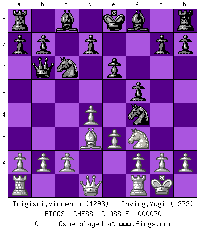Last move : 0-1 2009 January 31 20:20:9 [Event "FICGS__CHESS__CLASS_F__000070"] [Site "FICGS"] [Date "2008.11.27"] [Round "1"] [White "Trigiani,Vincenzo"] [Black "Inving,Yugi"] [Result "0-1"] [WhiteElo "1293"] [BlackElo "1272"] 1.d4 f5 2.Bf4 e6 3.Nc3 Nf6 4.Nb5 Nd5 5.Nxc7+ Nxc7 6.Nf3 Nc6 7.e3 Nd5 8.Bd3 Qb6 9.O-O Nxf4 0-1 This chess game has been lost on time (started : 2008.11.27 10:50:12) Dutch Kingside Castling by player White (move 9) Player Black won this chess game. Follow this game move after move (download)Chess is imagination. (David Bronstein) Über Frauen: Chess is better. (Robert James Fischer) El Ajedrez es un terrible juego. Si no controlas el centro, tu oponente tiene una posición mas holgada. Si tienes control del centro, ¡entonces realmente tu tienes algo de que preocuparte!. (Siegbert Tarrasch) Aucun coup ne doit être joué sans but. (Pedro Damiano) The beginning of wisdom is silence. The second step is listening. (Unknown)