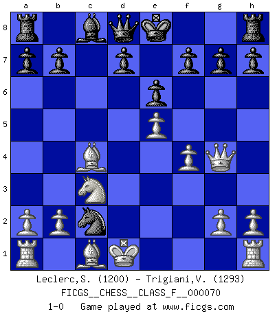 Last move : 1-0 2009 March 8 10:24:11 [Event "FICGS__CHESS__CLASS_F__000070"] [Site "FICGS"] [Date "2008.11.27"] [Round "1"] [White "Leclerc,Sophie"] [Black "Trigiani,Vincenzo"] [Result "1-0"] [WhiteElo "1200"] [BlackElo "1293"] 1.f4 c5 2.Nf3 e6 3.e4 Nf6 4.Nc3 c4 5.Bxc4 Nc6 6.Qe2 Bc5 7.e5 Ng4 8.d4 Bxd4 9.Nxd4 Nxd4 10.Qxg4 Nxc2+ 11.Kd1 1-0 Bird's Opening Player White won this chess game. Follow this game move after move (download)What would Chess be without silly mistakes ? (Kurt Richter) Es hat in meinem Leben Zeiten gegeben, da ich sehr nahe daran war zu glauben, daß ich auch nicht eine einzige Schachpartie verlieren könnte. (José Raúl Capablanca) Mis oponentes también hacen buenas movidas. A veces yo no tomo esas cosas en consideración. (Bobby Fischer) Tout change constamment, y compris dans le monde des Echecs. (Botvinnik) If you know the enemy and know yourself you need not fear the results of a hundred battles. (Sun Tzu)