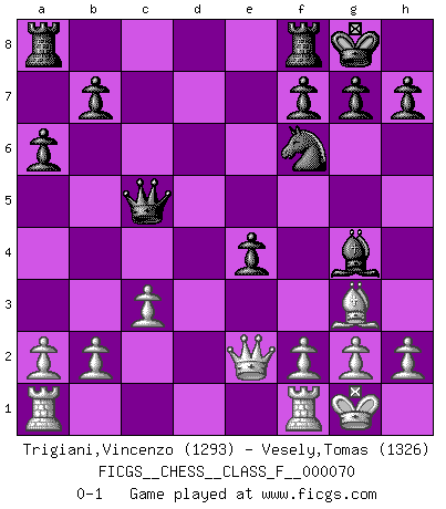 Last move : 0-1 2009 February 22 9:33:50 [Event "FICGS__CHESS__CLASS_F__000070"] [Site "FICGS"] [Date "2008.11.27"] [Round "1"] [White "Trigiani,Vincenzo"] [Black "Vesely,Tomas"] [Result "0-1"] [WhiteElo "1293"] [BlackElo "1326"] 1.d4 d5 2.Bf4 Nc6 3.Nc3 Nf6 4.Nb5 e5 5.Bg3 Bd6 6.Nxd6+ cxd6 7.dxe5 dxe5 8.Nf3 e4 9.Nd2 Qe7 10.e3 a6 11.Nb3 Bd7 12.Nc5 Qxc5 13.Be2 O-O 14.O-O d4 15.exd4 Nxd4 16.c3 Nxe2+ 17.Qxe2 Bg4 0-1 This chess game has been lost on time (started : 2008.11.27 10:50:12) Queen's pawn, Mason variation Kingside Castling by player Black (move 13) Kingside Castling by player White (move 14) Player Black won this chess game. Follow this game move after move (download)All Chess players should have a hobby. (Savielly Tartakower) Gegen einen Schachcomputer zu verlieren ist wie Löcher in den Strümpfen zuhaben. Es ist nicht peinlich, solange man der einzige ist der es weiß. (Anonymous) La pasion por jugar al Ajedrez es una de las mas inexplicables en el mundo. (H.G. Wells) Les erreurs sont comme les malheurs, elles n'arrivent jamais seules. (Siegbert Tarrasch) Computers make it easier to do a lot of things, but most of the things they make it easier to do don't need to be done. (Andy Rooney)