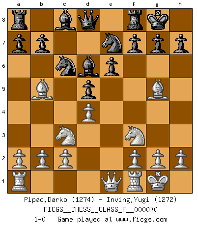 Last move : 1-0 2008 December 10 21:25:38 [Event "FICGS__CHESS__CLASS_F__000070"] [Site "FICGS"] [Date "2008.11.27"] [Round "1"] [White "Pipac,Darko"] [Black "Inving,Yugi"] [Result "1-0"] [WhiteElo "1274"] [BlackElo "1272"] 1.e4 c6 2.d4 d5 3.exd5 cxd5 4.Nc3 e6 5.Nf3 Nc6 6.Bb5 Bd6 7.O-O Nge7 8.Qe1 O-O 9.Bg5 1-0 Caro-Kann : Exchange variation Kingside Castling by player White (move 7) Kingside Castling by player Black (move 8) Player White won this chess game. Follow this game move after move (download)When you don't know what to play, wait for an idea to come into your opponent's mind. You may be sure that idea will be wrong. (Siegbert Tarrasch) Ich hatte Angst gegen einen russischen Großmeister zu verlieren, und er befürchtete gegen einen kleinen Jungen zu verlieren. (über ein Remis gegen Juri Awerbach). (Robert James Fischer) Debió haber existido una vez en que los hombres eran semidióses, de otra manera no hubiesen podido inventar el Ajedrez. (Gustav Schenk) La vie et les Echecs sont tous les deux une lutte constante. (Lasker) Internet: Absolute communication, absolute isolation. (Paul Carvel)