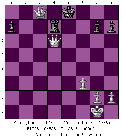 Last move : 1-0 2009 January 12 15:26:35 [Event "FICGS__CHESS__CLASS_F__000070"] [Site "FICGS"] [Date "2008.11.27"] [Round "1"] [White "Pipac,Darko"] [Black "Vesely,Tomas"] [Result "1-0"] [WhiteElo "1274"] [BlackElo "1326"] 1.e4 c5 2.Nf3 Nc6 3.Bb5 e5 4.c3 d5 5.Nxe5 Qb6 6.Qf3 Nh6 7.Bxc6+ bxc6 8.exd5 Bd6 9.Nxc6 O-O 10.d4 Re8+ 11.Be3 Qxb2 12.O-O Qxa1 13.dxc5 Ng4 14.cxd6 Ne5 15.Nxe5 Rxe5 16.Bd4 Rf5 17.Qg4 f6 18.Re1 Bd7 19.a3 Rb8 20.Qd1 Qb2 21.c4 Ba4 22.Bxb2 Bxd1 23.Rxd1 Rxb2 24.Nd2 Kf8 25.f3 Ke8 26.Re1+ Re5 27.Ne4 Kd7 28.Nc5+ Kxd6 29.Rxe5 fxe5 30.Ne4+ Kd7 31.Nc5+ Ke7 32.Nd3 Rb3 33.Nxe5 Rxa3 34.c5 Rc3 35.d6+ Kd8 36.Nc6+ Kd7 37.Ne5+ Kd8 38.c6 Re3 39.Nf7+ Ke8 40.d7+ Kxf7 41.d8Q Re8 42.Qd7+ Re7 43.Qd6 Ke8 44.c7 Rd7 45.c8Q+ 1-0 Sicilian : Nimzovich-Rossolimo attack (without ...d6) Kingside Castling by player Black (move 9) Kingside Castling by player White (move 12) Promotion Queen by player White (move 41) Promotion Queen by player White (move 45) Player White won this chess game. Follow this game move after move (download)In Chess, just as in life, today's bliss may be tomorrow's poison. (Assaic) Es gibt keine einzige Frau, der ich nicht einen Springer vorgeben könnte und trotzdem gewänne. (Robert James Fischer) Tu sabes, camarada Pachman, no disfruto el ser un Ministro, preferería jugar al Ajedrez como tu. (Che Guevara) Lorsque vous vous retrouvez devant une position atroce, ne tendez pas un ultime piège dérisoire avec l'intention d'abandonner si l'adversaire le déjoue ! Faites-vous plutôt un devoir de résister comme si votre vie en dépendait. Jouez le coup qui vous déplairait au centuple si vous étiez dans la peau de votre tortionnaire ! Wipe them out. All of them. (Darth Sidious in Star Wars ep.1)