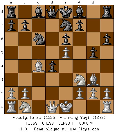 Last move : 1-0 2008 December 10 21:25:31 [Event "FICGS__CHESS__CLASS_F__000070"] [Site "FICGS"] [Date "2008.11.27"] [Round "1"] [White "Vesely,Tomas"] [Black "Inving,Yugi"] [Result "1-0"] [WhiteElo "1326"] [BlackElo "1272"] 1.e4 e6 2.Nf3 d5 3.e5 c5 4.c4 Ne7 5.d4 cxd4 6.Bg5 Nbc6 7.Bd3 h6 8.Bh4 dxc4 9.Bxc4 g5 10.Bg3 1-0 French defense Player White won this chess game. Follow this game move after move (download)In Fischer's hands, a slight theoretical advantage is as good a being a Queen ahead. (Isaac Kashdan) Schach ist gnadenlos. Du mußt bereit sein zu töten. (Nigel Short) Un jugador que es sorprendido, esta derrotado a medias. (Proverbio) Il vaut toujours mieux jouer un plan faux de façon logique que de n'avoir pas de plan du tout. (Victor Kortchnoï) Mac users swear by their computers. PC users swear at their computers. (Author unknown)