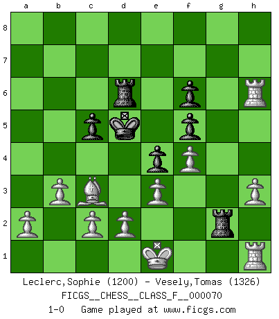 Last move : 1-0 2009 January 29 18:18:22 [Event "FICGS__CHESS__CLASS_F__000070"] [Site "FICGS"] [Date "2008.11.27"] [Round "1"] [White "Leclerc,Sophie"] [Black "Vesely,Tomas"] [Result "1-0"] [WhiteElo "1200"] [BlackElo "1326"] 1.f4 d5 2.Nf3 Nc6 3.e3 Bf5 4.Nc3 Nf6 5.Bb5 e6 6.Ne5 Qd6 7.g4 Ne4 8.gxf5 exf5 9.Bxc6+ bxc6 10.Nxe4 dxe4 11.b3 Qf6 12.Bb2 Qh4+ 13.Kf1 f6 14.Nxc6 Kd7 15.Nd4 Rd8 16.Qe2 Qh3+ 17.Qg2 Qg4 18.h3 Qxg2+ 19.Kxg2 g6 20.Kf2 Bg7 21.Rag1 c5 22.Nxf5 gxf5 23.Rxg7+ Ke6 24.Ke2 Rd6 25.Rxa7 Rhd8 26.Bc3 Rg8 27.Rxh7 Rg2+ 28.Ke1 Kd5 29.Rh6 1-0 Bird's Opening Player White won this chess game. Follow this game move after move (download)Chess is in its essence a game, in its form an art, and in its execution a science. (Baron Tassilo) Bogoljubow: Matt in vier Zügen! Tartakower: Ich verbitte mir jede Belästigung! (Savielly Grigorievitsch Tartakower) Muchos se han convertido en Maestros de Ajedrez, nadie se ha convertido en el Maestro del Ajedrez. (Siegbert Tarrasch) Vouloir jouer aux échecs contre soi-même est aussi paradoxal que vouloir marcher sur son ombre. (Stefan Zweig) Programming can only do so much before it becomes too much. (Don Groves)