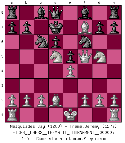 Last move : 1-0 2006 August 24 17:35:57 [Event "FICGS__CHESS__THEMATIC_TOURNAMENT__000007"] [Site "FICGS"] [Date "2006.08.21"] [Round "1"] [White "Melquiades,Jay"] [Black "Frame,Jeremy"] [Result "1-0"] [WhiteElo "1200"] [BlackElo "1277"] 1.Nf3 Nf6 2.d4 Ng8 3.e4 Nf6 4.Nc3 Ng8 5.Bc4 d6 6.Ng5 e6 7.Qf3 Nf6 8.d5 e5 9.Bd2 c6 10.dxc6 Nxc6 11.Bxf7+ Ke7 12.Nd5+ Kd7 13.Qf5+ 1-0 Reti Opening Player White won this chess game. Follow this game move after move (download)Chess is a fairy tale of 1001 blunders. (Savielly Tartakower) Wenn sie aufgeben, dann danke ich Ihnen für das Spiel (Eventualzug beim Fernschach). (Anonymous) Diferente gente reacciona diferentemente en aceptar la derrota. (Bobby Fischer) La conception d'un plan est le processus par lequel un joueur exploite les avantages de sa position tout en s'efforçant d'en réduire au minimum les inconvénients. Afin de garantir le succès, un plan doit toujours se fonder sur un diagnostic objectif des particularités d'une position. La conception d'un plan est d'autant plus difficile que la position est équilibrée, et grandement facilitée lorsqu'il n'existe qu'un seul plan susceptible de répondre aux exigences de la position. (Harry Golombek) They misunderestimated me. (George W. Bush, Bentonville nov. 6, 2000)