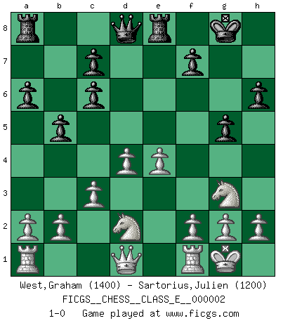 Last move : 1-0 2006 September 28 21:55:48 [Event "FICGS__CHESS__CLASS_E__000002"] [Site "FICGS"] [Date "2006.04.15"] [Round "1"] [White "West,Graham"] [Black "Sartorius,Julien"] [Result "1-0"] [WhiteElo "1400"] [BlackElo "1200"] 1.e4 e5 2.Nf3 Nc6 3.Bb5 Bc5 4.d3 Nf6 5.O-O a6 6.Bxc6 dxc6 7.Nxe5 O-O 8.Bg5 h6 9.Bh4 g5 10.Bg3 Bg4 11.c3 b5 12.Nxg4 Kg7 13.d4 Bd6 14.Nxf6 Bxg3 15.Nh5+ Kg8 16.Nxg3 Re8 17.Nd2 1-0 Ruy Lopez : Classical (Cordel) defense Kingside Castling by player White (move 5) Kingside Castling by player Black (move 7) Player White won this chess game. Follow this game move after move (download)Morphy was probably the greatest genius of them all. (Bobby Fischer) Es ist im Leben wie im Schachspiel. Wir entwerfen einen Plan, dieser bleibt jedoch bedingt durch das, was im Schachspiel dem Gegner, im Leben dem Schicksal zu tun belieben wird. (Arthur Schopenhauer) En el Ajedrez, tal como es jugado por los Maestros, practicamente la suerte es eliminada. (Emanuel Lasker) Je menace de comprendre la position. (Anonyme) Perhaps chess is the wrong game for the times (The Chess Master and the Computer, by Garry Kasparov - 2010)