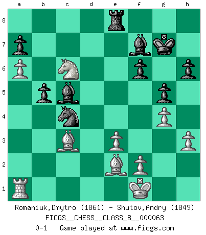 Last move : 0-1 2009 August 21 21:6:6 [Event "FICGS__CHESS__CLASS_B__000063"] [Site "FICGS"] [Date "2008.11.29"] [Round "1"] [White "Romaniuk,Dmytro"] [Black "Shutov,Andry"] [Result "0-1"] [WhiteElo "1861"] [BlackElo "1849"] 1.d4 d5 2.c4 c6 3.Nc3 dxc4 4.a4 e5 5.Nf3 exd4 6.Qxd4 Qxd4 7.Nxd4 Bc5 8.e3 Nf6 9.Bxc4 O-O 10.O-O Nbd7 11.a5 Ne5 12.Be2 Bd7 13.b3 Rfe8 14.Rd1 Rad8 15.Bb2 Bb4 16.a6 b6 17.Rac1 Bf8 18.h3 h6 19.Kf1 Rc8 20.Nb1 Nd5 21.Na3 f6 22.Nf3 Nf7 23.Nb5 cxb5 24.Rxd5 Rxc1+ 25.Bxc1 Be6 26.Rxb5 Nd6 27.Rb4 Nf5 28.Rf4 g5 29.Ra4 Bxb3 30.Ra1 Bc5 31.Bb2 Kg7 32.g4 Nd6 33.Nd4 Bf7 34.Nc6 Nc4 35.Bc3 b5 0-1 QGD Slav defense Kingside Castling by player Black (move 9) Kingside Castling by player White (move 10) Player Black won this chess game. Follow this game move after move (download)Bobby is the finest Chess player this country ever produced. His memory for the moves, his brilliance in dreaming up combinations, and his fierce determination to win are uncanny. (John Collins) Die Auseinandersetzung mit Karpow war politisch geprägt. Er stand für das kommunistische System, wurde von dessen Repräsentanten gehätschelt. Ich war der Oppositionelle. Jeder Schachweltmeister spiegelt auch die gesellschaftlichen Verhältnisse wider. Kramnik steht für die Börsen-Generation des Neuen Markts, ideologiefrei, zahlenfixiert. (Garry Kasparov) Hay dos clases de hombres: aquellos que se conforman en dejarse llevar por las circunstancias y que juegan barajas y aquellos decididos a controlar las circunstancias y que juegan al Ajedrez. (Mortimer Collins) Je ne suis pas le dernier à jouer lâchement des coups douteux pendant le zeïtnot de l'adversaire pour l'achever: en effet les coups qui font le plus peur sont ceux que l'on ne comprend pas. Je me fais souvent peur quand je joue. (Un professeur anonyme) Chess is as much a mystery as women. (Purdy)