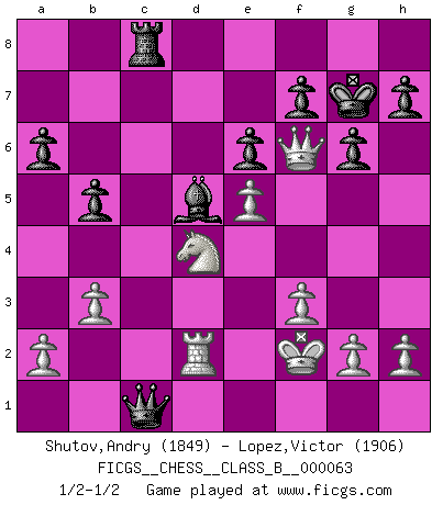 Last move : 1/2-1/2 2009 July 5 13:39:23 [Event "FICGS__CHESS__CLASS_B__000063"] [Site "FICGS"] [Date "2008.11.29"] [Round "1"] [White "Shutov,Andry"] [Black "Lopez,Victor"] [Result "1/2-1/2"] [WhiteElo "1849"] [BlackElo "1906"] 1.e4 c5 2.c3 Nf6 3.e5 Nd5 4.Nf3 Nc6 5.d4 cxd4 6.cxd4 d6 7.Bc4 Nb6 8.Bb5 Bd7 9.Nc3 dxe5 10.dxe5 g6 11.O-O Bg7 12.Bf4 O-O 13.Qe2 a6 14.Bxc6 Bxc6 15.Rfd1 Qe8 16.Rac1 Rd8 17.Nd4 Nd5 18.Nxd5 Bxd5 19.b3 e6 20.Qe3 Rc8 21.Rxc8 Qxc8 22.Bg5 Qc7 23.Bf6 Rc8 24.Bxg7 Kxg7 25.f3 Qa5 26.Qe2 Qc5 27.Qd2 b5 28.Kf2 Qc3 29.Qf4 Qb2+ 30.Rd2 Qc1 31.Qf6+ 1/2-1/2 Sicilian : Alapin's variation (2.c3) Kingside Castling by player White (move 11) Kingside Castling by player Black (move 12) This chess game ended in a draw. Follow this game move after move (download)A Chess game is a dialogue, a conversation between a player and his opponent. Each move by the opponent may contain threats or be a blunder, but a player cannot defend against threats or take advantage of blunders if he does not first ask himself: What is my opponent planning after each move ? (Bruce A. Moon) In Buenos Aires ist es nicht mein vorrangiges Ziel ein starkes Turnier zu organisieren, sondern ein Turnier für Gentlemen. Ich würde nie Kamsky einladen. Ich mag keine Probleme. (Miguel Najdorf) No nos podemos resistir a la fascinación de un sacrificio ya que la pasión por los sacrificios es parte de la naturaleza de un jugador de Ajedrez. (Rudolf Spielman) Comme les marins qui ont mille raisons différentes d'aller en mer, les joueurs d'échecs en ont tout autant avant de s'installer devant une table et jouer... (Vincent Bertignac, philosophe) The only thing that matters is the evidence. (Horatio Caine, C.S.I. Miami)