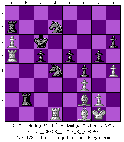 Last move : 1/2-1/2 2010 January 28 0:14:16 [Event "FICGS__CHESS__CLASS_B__000063"] [Site "FICGS"] [Date "2008.11.29"] [Round "1"] [White "Shutov,Andry"] [Black "Hamby,Stephen"] [Result "1/2-1/2"] [WhiteElo "1849"] [BlackElo "1921"] 1.e4 c5 2.c3 Nf6 3.e5 Nd5 4.Nf3 e6 5.Bc4 Nb6 6.Bb3 d6 7.O-O Nc6 8.d4 cxd4 9.cxd4 dxe5 10.dxe5 Qxd1 11.Rxd1 Na5 12.Bc2 Bd7 13.Nc3 Be7 14.Bd3 Bc6 15.Nd4 O-O-O 16.Be3 Nbc4 17.Nxc6 bxc6 18.Bxa7 Nxb2 19.Ba6+ Kc7 20.Rdc1 Nbc4 21.Ne4 Nxe5 22.Rab1 Nd7 23.Be3 Ra8 24.Bd3 Rhb8 25.Ra1 Rb4 26.f3 g6 27.Bf1 e5 28.Ng5 Bxg5 29.Bxg5 f6 30.Bd2 R4b8 31.Be1 f5 32.Bc3 c5 33.Rd1 Nc6 34.a4 Rb3 35.Bd2 Rb2 36.a5 Nd4 37.a6 Nb3 38.Bc3 Rc2 39.Bb5 Nd4 40.Ba5+ Kd6 41.Bd3 Rb2 42.Ra3 Kc6 43.Bc3 Rb6 44.Ra5 Rb3 45.Be1 Ra7 46.Bc4 Rb2 47.Bf2 Kb6 48.R5a1 Kc6 49.Ra5 h6 50.Bf1 g5 51.Re1 Kd6 52.Rd1 f4 53.h3 Kc6 54.h4 Rb8 55.Bd3 Rb3 56.Bc4 Rb2 57.Bf1 1/2-1/2 Sicilian : Alapin's variation (2.c3) Kingside Castling by player White (move 7) Queenside Castling by player Black (move 15) This chess game ended in a draw. Follow this game move after move (download)Blessed be the memory of him who gave the world this immortal game. (A. G. Gardiner) Ich verachte Kasparow. (Viktor Kortschnoi) El Ajedrez es una guerra en un tablero. El objetivo es aplastar la mente del oponente. (Bobby Fischer) Shah mat. Le roi est mort. Cri de fierté d'un joueur venant de terrasser son adversaire, courtoisement, sans effusion de sang. In my experience, there's no such thing as luck. (Obi-Wan Kenobi in Star Wars ep.4)