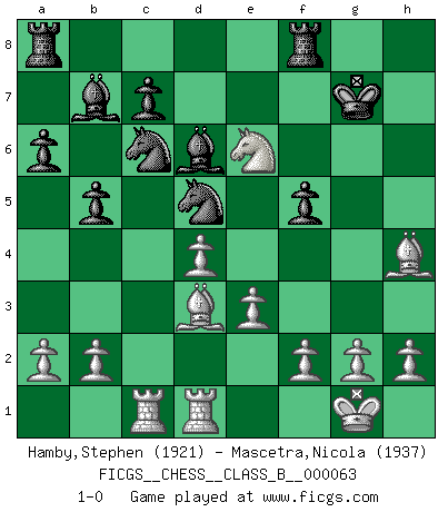 Last move : 1-0 2009 May 6 19:8:23 [Event "FICGS__CHESS__CLASS_B__000063"] [Site "FICGS"] [Date "2008.11.29"] [Round "1"] [White "Hamby,Stephen"] [Black "Mascetra,Nicola"] [Result "1-0"] [WhiteElo "1921"] [BlackElo "1937"] 1.d4 d5 2.c4 e6 3.Nc3 Nf6 4.Nf3 Nc6 5.Bg5 Bb4 6.e3 O-O 7.Bd3 h6 8.Bh4 dxc4 9.Bxc4 b6 10.O-O Bb7 11.Rc1 a6 12.Qe2 Bd6 13.Rfd1 b5 14.Bd3 Qe7 15.Ne4 g5 16.Nexg5 hxg5 17.Nxg5 Nd5 18.Qh5 f5 19.Qg6+ Qg7 20.Qxg7+ Kxg7 21.Nxe6+ 1-0 QGD : 4.Nf3 Kingside Castling by player Black (move 6) Kingside Castling by player White (move 10) Player White won this chess game. Follow this game move after move (download)He who fears an isolated Queen's Pawn should give up Chess. (Siegbert Tarrasch) Nach Morphy wurde nichts neues mehr in der Behandlung offener Positionen gefunden. (Mikhail Moiseyevich Botvinik) Las combinaciones han sido siempre el aspecto más intrigante del Ajedrez. Los Maestros las buscan, el público las aplauden, los críticos las alaban. La razón se debe a que las combinaciones hacen posible que el Ajedrez sea más que un ejercicio matemático con una carencia de vida. Ellas son la poesía del juego, son del Ajedrez lo que la melodía es de la música. Ellas representan el triunfo de la mente sobre la materia. (Reuben Fine) Il s'avisa de me proposer d'apprendre les échecs qu'il jouait un peu... me voilà forcené des échecs. J'achète un échiquier, je m'enferme dans ma chambre, j'y passe des jours et des nuits à vouloir apprendre par cur toutes les parties. (Jean-Jacques Rousseau, Confessions) SEO proverb : Make your website optimized for human beings, not for search engines.