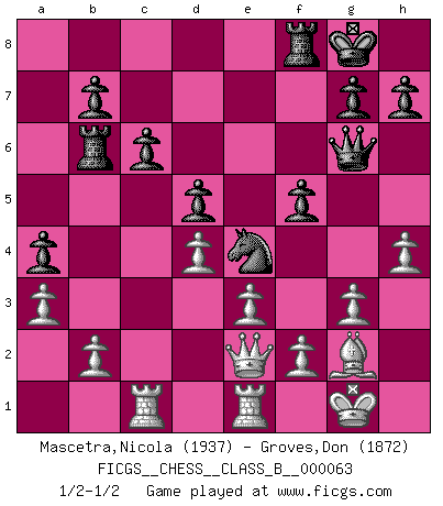 Last move : 1/2-1/2 2009 May 2 5:13:12 [Event "FICGS__CHESS__CLASS_B__000063"] [Site "FICGS"] [Date "2008.11.29"] [Round "1"] [White "Mascetra,Nicola"] [Black "Groves,Don"] [Result "1/2-1/2"] [WhiteElo "1937"] [BlackElo "1872"] 1.d4 Nf6 2.Nf3 e6 3.c4 d5 4.Nc3 Be7 5.Bg5 O-O 6.e3 Nbd7 7.Rc1 c6 8.cxd5 exd5 9.Bd3 Ne4 10.Bxe4 Bxg5 11.Nxg5 Qxg5 12.h4 Qe7 13.Bd3 Nf6 14.Qf3 Qb4 15.Qe2 Re8 16.O-O Bg4 17.Qc2 Bh5 18.Rfe1 Qd6 19.g3 Bf3 20.Be2 Be4 21.Nxe4 Nxe4 22.Bh5 a5 23.Bf3 f5 24.Bg2 a4 25.Bh3 Rf8 26.a3 Ra6 27.Bf1 Rb6 28.Bg2 Ra8 29.Red1 Ra5 30.Rb1 Rab5 31.Rd3 Ra6 32.Bf1 Ra8 33.R3d1 Rba5 34.Rbc1 Re8 35.Re1 R5a8 36.Qe2 Ra6 37.Bh3 Qg6 38.Qf3 Rf8 39.Bg2 Rb6 40.Qe2 1/2-1/2 Queen's pawn game Kingside Castling by player Black (move 5) Kingside Castling by player White (move 16) This chess game ended in a draw. Follow this game move after move (download)If a ruler does not understand Chess, how can he rule over a kingdom ? (King Khusros II) Stelle das Brett so, daß die Sonne in die Augen deines Gegners scheint. (Ruy López) El Ajedrez hace al hombre ser mas sabio y ver mas claro. (Vladimir Putin) Des points faibles ou des trous dans la position de l'adversaire doivent être occupés par des pièces et non pas par des pions. (Siegbert Tarrasch) Vladimir Ras-Putin is still alive... He is also a good actor, I saw him in the Lord of the Rings. (Rodolfo d'Ettorre)