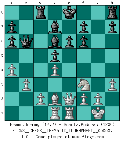 Last move : 1-0 2006 September 11 15:46:12 [Event "FICGS__CHESS__THEMATIC_TOURNAMENT__000007"] [Site "FICGS"] [Date "2006.08.21"] [Round "1"] [White "Frame,Jeremy"] [Black "Scholz,Andreas"] [Result "1-0"] [WhiteElo "1277"] [BlackElo "1200"] 1.Nf3 Nf6 2.d4 Ng8 3.e4 Nf6 4.Nc3 Ng8 5.Bc4 d6 6.Be3 Nf6 7.Qe2 c6 8.O-O d5 9.exd5 cxd5 10.Bd3 e6 11.Rfe1 Qa5 12.Bd2 Bb4 13.a3 Bd6 14.Ne4 Qb6 15.Nxf6+ gxf6 16.b3 Bd7 17.Rad1 Na6 18.a4 Rc8 19.Bxa6 bxa6 20.h3 1-0 Reti Opening Kingside Castling by player White (move 8) Player White won this chess game. Follow this game move after move (download)Capture of the adverse King is the ultimate but not the first object of the game. (William Steinitz) Jede Eröffnung ist gut genug um gespielt zu werden, wenn nur ihr Ruf schlecht genug ist. (Savielly Grigorievitsch Tartakower) Tu cuerpo tiene que estar en óptima condición. Tu Ajedrez se deteriora como lo hace tu cuerpo. No puedes separar la mente y el cuerpo. (Bobby Fischer) RxDa4 pat (...) The man who strikes first admits that his ideas have given out. (Chinese proverb)
