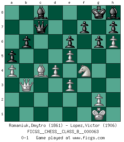 Last move : 0-1 2009 August 24 9:20:32 [Event "FICGS__CHESS__CLASS_B__000063"] [Site "FICGS"] [Date "2008.11.29"] [Round "1"] [White "Romaniuk,Dmytro"] [Black "Lopez,Victor"] [Result "0-1"] [WhiteElo "1861"] [BlackElo "1906"] 1.d4 Nf6 2.c4 g6 3.Nc3 d5 4.cxd5 Nxd5 5.e4 Nxc3 6.bxc3 Bg7 7.Bc4 c5 8.Ne2 Nc6 9.Be3 O-O 10.O-O Na5 11.Bd3 b6 12.Rc1 Qd6 13.e5 Qd7 14.Nf4 Bb7 15.Qe2 e6 16.Rfd1 Qe7 17.Qg4 cxd4 18.cxd4 Rac8 19.h4 Rxc1 20.Rxc1 Rc8 21.Rxc8+ Bxc8 22.h5 Bb7 23.h6 Bh8 24.Be2 Nc6 25.Bc4 a6 26.a4 Bc8 27.Qd1 Qc7 28.Qe2 a5 29.Qa2 Bb7 30.Qb3 Ne7 31.Be2 Nd5 32.Bf3 Nxe3 33.fxe3 Bc8 34.Be2 Qd8 35.Bc4 Qc7 0-1 King's Indian defense, 3.Nc3 Kingside Castling by player Black (move 9) Kingside Castling by player White (move 10) Player Black won this chess game. Follow this game move after move (download)In the perfect Chess combination as in a first-rate short story, the whole plot and counter-plot should lead up to a striking finale, the interest not being allayed until the very last moment. (Yates and Winter) Je mehr wir mit Computern analysieren, desto mehr glauben wir an Verteidigung. (Vladimir Kramnik) Ciertamente, de todas la drogas del mundo, el Ajedrez debe ser el mas placentero permamentemente. (Assiac) Un journaliste : 'Vous préférez avoir une dame de plus sur l'échiquier ou au lit ?' Boris Spassky : 'Ca dépend de la position.' Drag your thoughts away from your troubles... by the ears, by the heels, or any other way you can manage it. (Mark Twain)