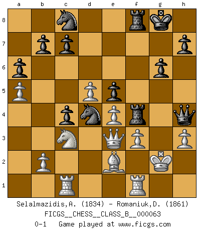 Last move : 0-1 2009 April 28 16:20:0 [Event "FICGS__CHESS__CLASS_B__000063"] [Site "FICGS"] [Date "2008.11.29"] [Round "1"] [White "Selalmazidis,Arsenis"] [Black "Romaniuk,Dmytro"] [Result "0-1"] [WhiteElo "1834"] [BlackElo "1861"] 1.d4 Nf6 2.c4 g6 3.Nc3 d5 4.Nf3 Bg7 5.g3 O-O 6.Bg2 dxc4 7.O-O Nc6 8.e4 Bg4 9.Be3 Nd7 10.h3 Bxf3 11.Bxf3 e5 12.d5 Nd4 13.Be2 Nb6 14.Rc1 f5 15.f3 f4 16.gxf4 Bh6 17.Qd2 Bxf4 18.Bxf4 Rxf4 19.Qe3 Qh4 20.Kg2 Raf8 21.a4 a6 22.a5 Nc8 0-1 This chess game has been lost on time (started : 2008.11.29 7:57:57) King's Indian defense, 3.Nc3 Kingside Castling by player Black (move 5) Kingside Castling by player White (move 7) Player Black won this chess game. Follow this game move after move (download)Chess demands total concentration. (Bobby Fischer) Im Schach gewinnt jeder. Hat man Freunde am Spiel - und das ist die Hauptsache - ist auch der Verlust einer Partie kein Unglück. (David Bronstein) Una partida de Ajedrez se divide en 3 etapas: la primera cuando piensas que tienes la ventaja, la segunda cuando crees que tienes la ventaja y la tercera... ¡cuando te das cuenta que vas a perder!. (Savielly Tartakower) La tactique, c'est ce que vous faites quand il y a quelque chose à faire; la stratégie, c'est ce que vous faites quand il n'y a rien à faire. (Savielli Tartacower) If you are good, you will be assigned all the work. If you are really good, you will get out of it. (Dan Rotaru)