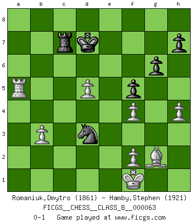 Last move : 0-1 2009 September 9 21:51:56 [Event "FICGS__CHESS__CLASS_B__000063"] [Site "FICGS"] [Date "2008.11.29"] [Round "1"] [White "Romaniuk,Dmytro"] [Black "Hamby,Stephen"] [Result "0-1"] [WhiteElo "1861"] [BlackElo "1921"] 1.d4 f5 2.c4 Nf6 3.Nc3 e6 4.g3 Bb4 5.Bg2 O-O 6.Nf3 b6 7.Ng5 d5 8.O-O c6 9.Qb3 a5 10.Bf4 dxc4 11.Qxc4 Nd5 12.Qb3 Nxf4 13.gxf4 Qxd4 14.Nxe6 Bxe6 15.Qxe6+ Kh8 16.e3 Qf6 17.Qxf6 Rxf6 18.Rfd1 Ra7 19.Rd8+ Rf8 20.Rad1 Raf7 21.R8d3 g6 22.Na4 b5 23.Nc3 Rc8 24.Ne2 Be7 25.b3 Bf6 26.Kf1 Ra7 27.Rd6 Be7 28.Re6 Kg8 29.Nd4 Rd7 30.Rc1 Kf7 31.Re5 Rdc7 32.Rc2 Bf6 33.Rec5 Bxd4 34.exd4 Ke7 35.d5 Na6 36.Rxc6 Kd7 37.h4 Nb4 38.R2c5 Nxa2 39.Rxb5 Nb4 40.Rxc7+ Rxc7 41.Rxa5 Nd3 0-1 Dutch with c4 & Nc3 Kingside Castling by player Black (move 5) Kingside Castling by player White (move 8) Player Black won this chess game. Follow this game move after move (download)A good player is always lucky. (Jose Raul Capablanca) Deine Wertungszahl - vorausgesetzt einige Jahre schachliche Anstrengung - entspricht etwa dem zehnfachen Deines IQ plus 1000. (Jonathan Levitt) ¿Porque tengo que perder ante este idiota?. (Aron Nimzovich) Il n'y a pas de prix trop élevé au scalp de l'ennemi. (Koblentz) To send light into the darkness of men's hearts - such is the duty of the artist. (Schumann)