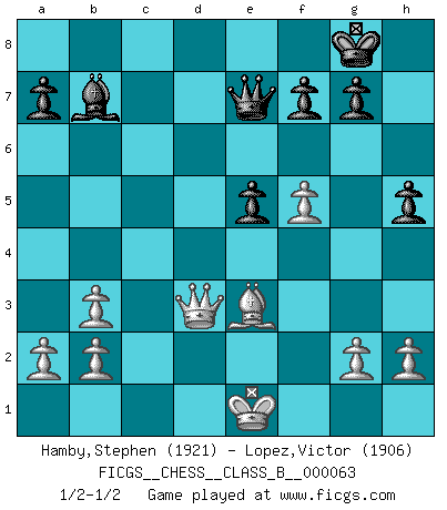 Last move : 1/2-1/2 2009 May 8 21:56:30 [Event "FICGS__CHESS__CLASS_B__000063"] [Site "FICGS"] [Date "2008.11.29"] [Round "1"] [White "Hamby,Stephen"] [Black "Lopez,Victor"] [Result "1/2-1/2"] [WhiteElo "1921"] [BlackElo "1906"] 1.e4 c5 2.Nf3 e6 3.d4 cxd4 4.Nxd4 Nf6 5.Nc3 d6 6.Be3 Be7 7.f4 Nc6 8.Qf3 e5 9.Nxc6 bxc6 10.f5 O-O 11.O-O-O Qa5 12.Bc4 Rb8 13.Bb3 Rxb3 14.cxb3 d5 15.exd5 cxd5 16.Rxd5 Nxd5 17.Nxd5 Bh4 18.Nc3 Rd8 19.Qe4 Be7 20.Rd1 Rxd1+ 21.Kxd1 Qc7 22.Qd3 h5 23.Nd5 Qd6 24.Nxe7+ Qxe7 25.Ke1 Bb7 1/2-1/2 Sicilian : Anderssen variation Kingside Castling by player Black (move 10) Queenside Castling by player White (move 11) This chess game ended in a draw. Follow this game move after move (download)Chess is not like life... it has rules ! (Mark Pasternak) Wenn Capablanka heute auf der Schachbühne erscheinen würde, hätte er ein halbes Jahr gebraucht um sich die Schachtheorie anzueignen. Und dann hätte er alles und jeden besiegt. (Mikhail Moiseyevich Botvinik) La vida es como un juego de Ajedrez, cambiando con cada movimiento. (Proverbio Chino) Psychologiquement, tu dois avoir confiance en toi même, mais cette confiance doit être basée sur des faits. (Robert Fischer) The intuitive mind is a sacred gift; the rational mind is a faithful servant. We have created a society that honors the servant but has forgotten the gift. (Albert Einstein)
