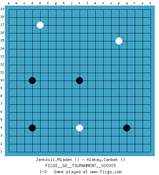 Last move : 1-0 2006 October 9 17:47:35 [Event "FICGS__GO__TOURNAMENT__000009"] [Site "FICGS"] [Date "2006.08.21"] [Round "1"] [Black "Jankovic,Mladen"] [White "Alakay,Canbek"] [Result "1-0"] 1.k10 p15 2.d4 e17 3.q4 k4 4.d10 1-0 This go game has been lost on time (started : 2006.08.21 21:19:40) Here are the names of the openings (joseki) played in the four corners : Corner d4 : d4 1-0 Hoshi (Hwajeom, Seongjeom, Xingwei`) 4-4 Point. The star or hoshi (4-4) point, emphasizing influence at the potential expense of territory. Player Black won this Go (weiqi, baduk) game. Follow this game move after move (download)Error is one of the sources of transformation. (Pierre Audouard) Never was anything great achieved without danger. (Niccolo Machiavelli)