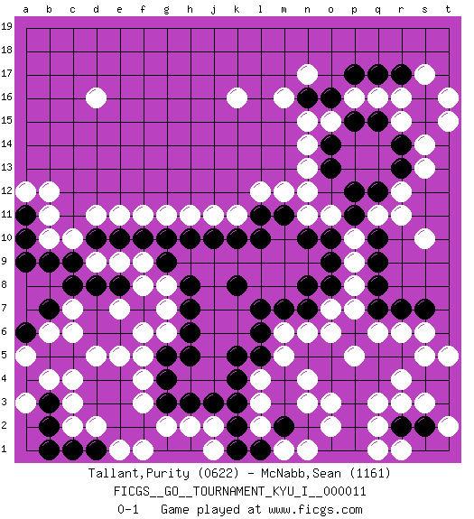 Last move : 0-1 2009 May 17 6:10:26 [Event "FICGS__GO__TOURNAMENT_KYU_I__000011"] [Site "FICGS"] [Date "2008.12.01"] [Round "1"] [Black "Tallant,Purity"] [White "McNabb,Sean"] [Result "0-1"] [Rating 1 "0622"] [Rating 2 "1161"] 1.d4 q16 2.q10 d16 3.d10 r3 4.q4 q3 5.p3 r4 6.p4 r6 7.r5 s5 8.q5 l3 9.k4 l4 10.l5 m5 11.k5 n4 12.o5 m6 13.n5 o7 14.k3 o3 15.p6 p7 16.o4 n3 17.p2 o2 18.o1 n1 19.p1 r1 20.r2 q2 21.s2 q1 22.s4 s3 23.t4 t5 24.t3 t2 25.q7 q6 26.r7 s6 27.s7 k16 28.n7 n6 29.o8 p8 30.q8 p9 31.n8 s10 32.q9 r12 33.o9 p10 34.p11 q11 35.o10 o6 36.l7 o11 37.p12 n11 38.m7 k11 39.l6 p5 40.q12 r11 41.k10 n14 42.k8 j11 43.j10 h11 44.h10 g11 45.g10 f11 46.f10 e11 47.e10 d11 48.l11 l12 49.m11 m12 50.n10 n12 51.l10 c10 52.c9 b10 53.b9 c3 54.d3 d2 55.e2 c4 56.d1 c2 57.c1 d5 58.b2 e5 59.e4 f4 60.e3 f3 61.f2 g2 62.g3 f1 63.a10 b11 64.a11 a12 65.a9 b12 66.m2 l2 67.k2 g6 68.l1 g8 69.h8 e7 70.f7 f8 71.h6 g7 72.g5 f5 73.g4 d9 74.d8 e9 75.e8 f9 76.c8 c6 77.h7 c7 78.g9 f6 79.h5 h2 80.h3 j2 81.j3 m1 82.k1 j1 83.b1 e1 84.b3 b4 85.b7 b6 86.a6 a5 87.a4 a3 88.r13 s13 89.r14 s14 90.s15 r15 91.q15 r16 92.o14 o15 93.p15 p16 94.o16 n15 95.n16 m16 96.o13 n13 97.s16 s17 98.r17 t16 99.p17 t15 100.q17 n17 0-1 This go game has been lost on time (started : 2008.12.01 20:8:55) Here are the names of the openings (joseki) played in the four corners : Corner q4 : r3 q4 San-San (Sam-Sam, San-San) 3-3 Point. The San-San (3-3) point, emphasizing territory at the expense of influence. Kata-tsuki (shoulder hit). The shoulder-hit is the traditional answer to the 3-3. The direction of White 3 depends on the positions on the side. Crawling once may be the premise for a follow-up move of sliding with a knight's move in the opposite direction. If White plays 3 at 3-4 (to the right), the follow-on knight's move is then played at the top (e.g. 3-4, 4-5, 5-2). White's knight's move reduces territory potential on the side it is played. Player White won this Go (weiqi, baduk) game. Follow this game move after move (download)One big eye kills one small eye. (Anonymous) When the going gets tactical, the computers get going. (Hyatt)