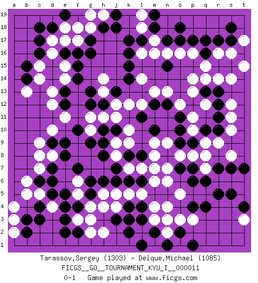 Last move : 0-1 2009 March 20 11:12:9 [Event "FICGS__GO__TOURNAMENT_KYU_I__000011"] [Site "FICGS"] [Date "2008.12.01"] [Round "1"] [Black "Tarassov,Sergey"] [White "Delque,Michael"] [Result "0-1"] [Rating 1 "1303"] [Rating 2 "1085"] 1.q16 d4 2.q4 d16 3.q10 d10 4.k4 k10 5.k16 h4 6.h10 k12 7.j13 j12 8.h12 h13 9.g13 h14 10.k14 h11 11.g12 g11 12.f14 e11 13.g16 e15 14.f15 e14 15.e13 d13 16.e12 d12 17.j10 j11 18.j7 j9 19.h9 k9 20.h8 j5 21.k6 k5 22.l4 l5 23.l8 k7 24.k8 j8 25.h6 l7 26.l6 m7 27.j6 m6 28.m5 m8 29.d6 c5 30.f4 h5 31.g6 f5 32.g5 g4 33.e5 f3 34.e4 g3 35.e3 m4 36.n5 m3 37.c3 c7 38.c6 b6 39.c4 b5 40.d5 r6 41.r5 r9 42.r10 p11 43.m10 m9 44.o10 p10 45.p9 q9 46.r7 p8 47.o9 s10 48.r11 s11 49.r12 o8 50.l11 l12 51.m12 s12 52.r13 m13 53.n12 l14 54.k15 n13 55.j3 k3 56.l3 l2 57.k2 j4 58.k3 h2 59.m2 n2 60.l1 n3 61.f2 g2 62.e2 o5 63.n1 o1 64.o2 m1 65.c17 d17 66.n1 n4 67.p1 s6 68.q6 q7 69.p7 q8 70.p6 t3 71.o7 n6 72.s5 t5 73.s7 t6 74.t7 s8 75.t4 o12 76.o11 p13 77.n8 n9 78.q13 p14 79.p12 q12 80.n15 p16 81.p17 q15 82.r15 r16 83.q17 r14 84.s15 q14 85.c16 c15 86.b15 c14 87.b14 b13 88.d18 e18 89.c18 f17 90.g17 g18 91.h18 s16 92.d7 c8 93.e9 d8 94.e8 f6 95.f7 h19 96.j18 o16 97.n17 n16 98.o17 m16 99.s17 s14 100.r17 t15 101.f16 m17 102.j19 g19 103.m18 a2 104.b2 a3 105.b3 a4 106.d9 c9 107.f10 l18 108.m19 l19 109.o18 n7 110.e16 e17 111.e19 f18 112.l17 l16 113.k17 t17 114.s18 g10 115.g9 p3 116.p4 o3 0-1 Here are the names of the openings (joseki) played in the four corners : Corner d16 : d16 j13 Hoshi (Hwajeom, Seongjeom, Xingwei`) 4-4 Point. The star or hoshi (4-4) point, emphasizing influence at the potential expense of territory. Corner q16 : q16 p11 Hoshi (Hwajeom, Seongjeom, Xingwei`) 4-4 Point. The star or hoshi (4-4) point, emphasizing influence at the potential expense of territory. Player White won this Go (weiqi, baduk) game. Follow this game move after move (download)The monkey jump is worth eight points. (Anonymous) Whatever you do, don't be bored. This is absolutely the most exciting time we could have possibly hoped to be alive. And things are just starting. (From movie Waking life)