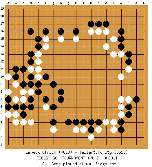 Last move : 1-0 2009 April 10 14:31:54 [Event "FICGS__GO__TOURNAMENT_KYU_I__000011"] [Site "FICGS"] [Date "2008.12.01"] [Round "1"] [Black "Imbeck,Ulrich"] [White "Tallant,Purity"] [Result "1-0"] [Rating 1 "0819"] [Rating 2 "0622"] 1.q16 d4 2.q4 p3 3.q3 p4 4.d16 q5 5.r5 q6 6.r6 r7 7.s7 q7 8.d10 q10 9.c6 b5 10.c5 c4 11.b6 b4 12.r12 o14 13.k16 o16 14.q14 p13 15.j4 g3 16.m17 m16 17.n17 n16 18.o17 p15 19.q15 q13 20.r13 r11 21.l4 k3 22.k4 l3 23.n4 n3 24.m3 m2 25.m4 o4 26.g4 k15 27.h16 h15 28.f16 f15 29.e15 f14 30.e14 e13 31.d13 e12 32.d12 e10 33.e9 e11 34.d9 d11 35.c11 c8 36.d7 d8 37.e8 c7 38.d6 b7 39.a7 a8 40.a6 a5 41.g9 c10 42.c9 b9 43.b10 a10 44.b11 f9 45.f10 f8 46.f7 g8 47.h8 g7 48.g6 f6 49.h7 1-0 This go game has been lost on time (started : 2008.12.01 20:8:55) Here are the names of the openings (joseki) played in the four corners : Corner q4 : q4 p3 Hoshi (Hwajeom, Seongjeom, Xingwei`) 4-4 Point. The star or hoshi (4-4) point, emphasizing influence at the potential expense of territory. Corner d4 : d4 c6 Hoshi (Hwajeom, Seongjeom, Xingwei`) 4-4 Point. The star or hoshi (4-4) point, emphasizing influence at the potential expense of territory. Ikken Kakari (Hankan Keolch'im, Yi Gua`jiao~, 1-Space Low Approach). Black 2 is the standard approach move to the 4-4. Player Black won this Go (weiqi, baduk) game. Follow this game move after move (download)The poor player plays the opponent's game for him. (Anonymous) Two beer, or not two beer. (Unknown)