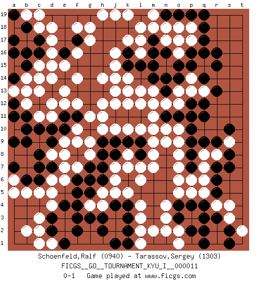 Last move : 0-1 2009 January 24 16:34:3 [Event "FICGS__GO__TOURNAMENT_KYU_I__000011"] [Site "FICGS"] [Date "2008.12.01"] [Round "1"] [Black "Schoenfeld,Ralf"] [White "Tarassov,Sergey"] [Result "0-1"] [Rating 1 "0940"] [Rating 2 "1303"] 1.r16 d4 2.q3 d16 3.q9 p17 4.p16 o16 5.p15 o15 6.o14 l16 7.d10 f10 8.c6 c5 9.d7 c11 10.c10 d11 11.j4 q5 12.p4 p6 13.n5 q8 14.p9 r8 15.r9 p11 16.o11 o10 17.p10 o12 18.n11 n12 19.p12 p13 20.q11 p14 21.q17 p18 22.q18 n17 23.f3 m11 24.m12 n10 25.p11 m9 26.n14 m13 27.l12 o13 28.m14 l13 29.n13 q15 30.q16 q13 31.r13 b8 32.b6 b5 33.b11 b12 34.b10 c13 35.q12 f7 36.l15 k13 37.g16 j16 38.k15 j15 39.m16 l17 40.m17 m18 41.n16 n15 42.m15 o18 43.o17 o16 44.o15 g4 45.g3 h4 46.h3 j5 47.k4 k5 48.l5 l6 49.m6 m7 50.n7 l7 51.c17 d17 52.c16 c15 53.b15 b14 54.d15 c14 55.a16 c18 56.b18 b17 57.b16 b19 58.a17 d18 59.k16 k17 60.j14 k12 61.l11 m10 62.k11 k14 63.h13 j12 64.j11 h12 65.j17 h14 66.h15 j13 67.h16 j14 68.j18 k19 69.k18 l18 70.n19 g18 71.h18 g17 72.f17 f18 73.h17 n18 74.f15 e15 75.e14 d14 76.e16 d15 77.g14 e13 78.f13 f14 79.g12 g13 80.e14 f12 81.h13 g11 82.g13 f14 83.g15 h11 84.p19 h19 85.o19 m19 86.q19 j19 87.e14 l4 88.m5 f14 89.a19 j3 90.k3 j2 91.k2 r4 92.r3 f16 93.f4 e6 94.k6 h5 95.f5 g6 96.f6 d6 97.c8 b7 98.c7 a6 99.b9 e7 100.a7 s3 101.g7 j7 102.h6 j6 103.g5 g8 104.d3 a8 105.a9 r2 106.q2 c3 107.d2 r1 108.q4 l2 109.h2 l3 110.j1 s4 111.q1 o5 112.o4 o8 113.p8 n4 114.m4 n3 115.m3 m2 116.n6 o2 117.o3 n2 118.n8 p5 119.s2 o7 120.p7 n9 121.r5 q6 122.r6 q7 123.s8 o6 124.r7 o9 125.p2 c19 126.f8 c2 127.h8 g9 128.j8 j10 129.h7 k7 130.e8 b2 131.e4 d5 132.a12 k8 133.j9 k10 134.k9 l10 135.e10 e9 136.d9 f9 137.a14 a13 138.b13 s9 139.s7 a13 140.m12 l12 141.b13 t2 142.s1 a13 143.r15 b13 144.q14 m12 145.a7 a5 146.e11 d12 147.f11 d8 148.l9 d1 149.e1 c1 150.l8 m8 151.f2 e8 152.s10 l1 153.h9 h10 154.g6 o1 155.a11 o17 156.k1 e12 0-1 Here are the names of the openings (joseki) played in the four corners : Corner q16 : r16 p17 Komoku (Somok, Xiao~mu`) 3-4 Point. The komoku (3-4) point is the traditional corner enclosure move.. Ikken Kakari (Hankan Keolch'im, Yi Gua`jiao~, 1-Space Low Pincer). The small knight move is the basic approach move to the 3-4 point stone. It has been continually used for over four centuries. There are limitless variations, with new moves constantly being discovered. White 2 opens the door to a treaure store of joseki. Corner d4 : d4 c6 Hoshi (Hwajeom, Seongjeom, Xingwei`) 4-4 Point. The star or hoshi (4-4) point, emphasizing influence at the potential expense of territory. Ikken Kakari (Hankan Keolch'im, Yi Gua`jiao~, 1-Space Low Approach). Black 2 is the standard approach move to the 4-4. Player White won this Go (weiqi, baduk) game. Follow this game move after move (download)In the opening, when you don't know what to play, make a shimari. (Jansteen) When you stop learning you start dying. (Scott Adams)
