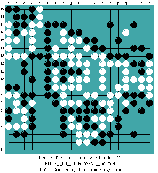 Last move : 1-0 2007 January 16 10:43:16 [Event "FICGS__GO__TOURNAMENT__000009"] [Site "FICGS"] [Date "2006.08.21"] [Round "1"] [Black "Groves,Don"] [White "Jankovic,Mladen"] [Result "1-0"] 1.d4 q16 2.r3 d16 3.c17 d17 4.d18 q10 5.b16 d15 6.b18 c19 7.d19 c16 8.a19 e18 9.d10 e19 10.c18 a16 11.b19 b15 12.a15 a14 13.b17 a17 14.o17 a15 15.r14 k4 16.k16 q9 17.r17 k10 18.q6 n12 19.p15 n10 20.m4 n11 21.h4 p9 22.k5 j5 23.l5 m5 24.m6 n5 25.n6 n4 26.l4 j4 27.j6 l6 28.l7 o6 29.m7 m3 30.p4 n7 31.h5 l3 32.k6 k3 33.o3 k7 34.k8 j7 35.j8 h7 36.h6 h8 37.n8 o7 38.n3 o5 39.c7 p12 40.r12 g13 41.f8 l8 42.h3 m8 43.l6 k2 44.m2 l2 45.n2 n9 46.h17 j15 47.f11 j9 48.h10 k9 49.h12 j12 50.j11 j13 51.n14 o8 52.r8 r10 53.l13 l12 54.k11 l11 55.f16 e17 56.f14 g14 57.f13 h13 58.g12 k12 59.k14 m13 60.m14 n13 61.o13 o12 62.p13 q12 63.q13 q11 64.g7 h9 65.g8 j14 66.f15 h15 67.f17 d14 68.d13 c13 69.e13 b13 70.c12 a13 71.c11 c4 72.c3 b4 73.b3 c5 74.d5 c6 75.d6 b7 76.c8 b8 77.b9 a8 78.a6 b6 79.a5 a4 80.a9 d7 81.d8 p8 82.q8 l10 83.p5 j10 84.h11 g9 85.f9 g10 86.f10 q7 87.r7 g11 88.f12 k15 89.l15 k13 90.m15 l14 91.j16 h16 92.g17 s10 93.s12 s9 94.s8 t8 95.t7 t9 96.s6 t12 97.t13 t11 98.s11 t10 99.s14 1-0 Here are the names of the openings (joseki) played in the four corners : Corner d16 : d16 c17 Hoshi (Hwajeom, Seongjeom, Xingwei`) 4-4 Point. The star or hoshi (4-4) point, emphasizing influence at the potential expense of territory. Corner q16 : q16 o17 Hoshi (Hwajeom, Seongjeom, Xingwei`) 4-4 Point. The star or hoshi (4-4) point, emphasizing influence at the potential expense of territory. Ikken Kakari (Hankan Keolch'im, Yi Gua`jiao~, 1-Space Low Approach). Black 2 is the standard approach move to the 4-4. Corner q4 : r3 q9 San-San (Sam-Sam, San-San) 3-3 Point. The San-San (3-3) point, emphasizing territory at the expense of influence. Player Black won this Go (weiqi, baduk) game. Follow this game move after move (download)If you don't know ladders, don't play go. (Anonymous) Imagination is more important than knowledge. Knowledge is limited. Imagination encircles the world. (Albert Einstein)