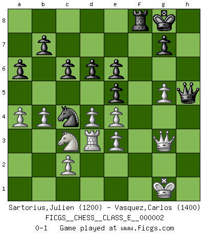 Last move : 0-1 2006 September 4 19:19:38 [Event "FICGS__CHESS__CLASS_E__000002"] [Site "FICGS"] [Date "2006.04.15"] [Round "1"] [White "Sartorius,Julien"] [Black "Vasquez,Carlos"] [Result "0-1"] [WhiteElo "1200"] [BlackElo "1400"] 1.e4 e5 2.Nc3 Nf6 3.Bc4 Bc5 4.d3 h6 5.Nf3 d6 6.O-O c6 7.h3 O-O 8.a3 a6 9.b4 Ba7 10.g4 Nh7 11.Be3 Bxe3 12.fxe3 Be6 13.Bxe6 fxe6 14.Qe1 Nd7 15.d4 Nb6 16.Rd1 Qe7 17.Qe2 Ng5 18.a4 Nxf3+ 19.Rxf3 Rxf3 20.Qxf3 Rf8 21.Qg3 Qf6 22.h4 Nc4 23.g5 hxg5 24.hxg5 Qg6 25.Rd3 Qh5 0-1 Vienna game Kingside Castling by player White (move 6) Kingside Castling by player Black (move 7) Player Black won this chess game. Follow this game move after move (download)A passed Pawn increases in strength as the number of pieces on the board diminishes. (Capablanca) Obwohl ich vom Stil her kaum zu den Priestern der Schachkunst gezählt werde, halte ich Schach doch für eine Kunst. (Tigran Petrosjan) Nunca nadie ha ganado una partida de Ajedrez rindiendose. (Unknown) L'action d'une oeuvre littéraire se déroule sur un champ de bataille. Les masques et les types du drame moderne correspondent aux pièces du jeu d'échecs. L'intrigue correspond aux coups et aux gambits, c'est à dire aux techniques du jeu telles qu'utilisées et interprétées par les joueurs. Les tactiques et les péripéties [mouvements] correspondent aux coups exécutés par l'adversaire. (Viktor Shklovsky) When you stop learning you start dying. (M. Scott Adams)