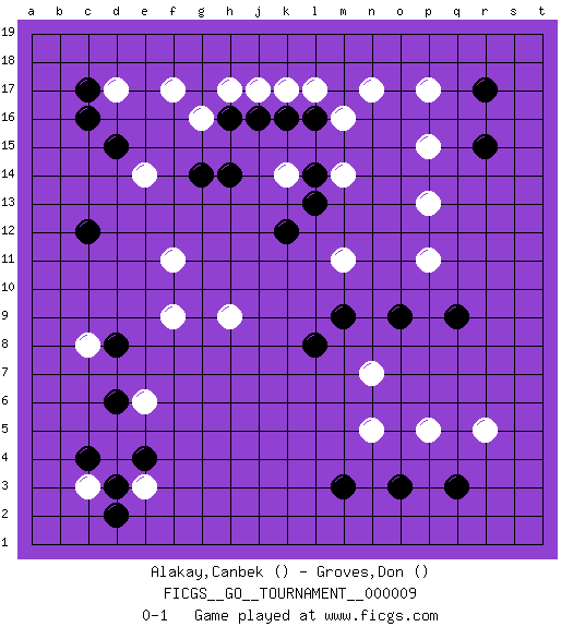 Last move : 0-1 2006 October 23 19:32:38 [Event "FICGS__GO__TOURNAMENT__000009"] [Site "FICGS"] [Date "2006.08.21"] [Round "1"] [Black "Alakay,Canbek"] [White "Groves,Don"] [Result "0-1"] 1.l8 e14 2.e4 p15 3.d15 n5 4.q3 e6 5.d8 f9 6.c4 c8 7.d6 d17 8.c17 f11 9.k12 k14 10.k16 k17 11.l16 m16 12.j16 l17 13.l14 n17 14.r17 p5 15.o3 r5 16.m3 p17 17.r15 n7 18.q9 p11 19.o9 p13 20.m9 h9 21.c12 c3 22.d3 e3 23.d2 f17 24.c16 j17 25.h16 h17 26.g14 g16 27.h14 m14 28.l13 m11 0-1 This go game has been lost on time (started : 2006.08.21 21:19:40) Here are the names of the openings (joseki) played in the four corners : Corner d16 : e14 d15 This joseki is unknown. A weak or weird move has probably been played in this corner. Corner q4 : l8 n5 This joseki is unknown. A weak or weird move has probably been played in this corner. Corner d4 : e4 e6 Takamoku (Gomok, Gaomu`) 5-4 Point. The takamoku (high) point (5-4). With its emphasis on influence, the 5-4 point complements the 4-4 (hoshi) point in creating an influence-oriented fuseki. Corner q16 : p15 l16 Go-no-go (Wu~wu~) 5-5 Point. The 5-5 was experimented with briefly during the "New Fuseki" movement in Japan in the 1930s. The 5-5 point has not retained popularity because the 4-4 hoshi (star) point strikes a better balance between influence and territory. As one can see from the variations, though, the 5-5 is playable. Player White won this Go (weiqi, baduk) game. Follow this game move after move (download)The game plays itself, the players don't control it. (Pierre Audouard) Art is not a thing, it is a way. (Elbert Hubbard)