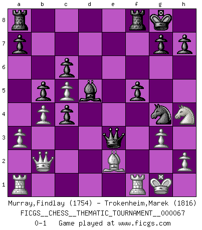 Last move : 0-1 2009 January 5 22:5:53 [Event "FICGS__CHESS__THEMATIC_TOURNAMENT__000067"] [Site "FICGS"] [Date "2008.12.04"] [Round "1"] [White "Murray,Findlay"] [Black "Trokenheim,Marek"] [Result "0-1"] [WhiteElo "1754"] [BlackElo "1816"] 1.b4 d5 2.Bb2 Qd6 3.a3 e5 4.e3 Be6 5.Nf3 f6 6.d4 e4 7.Nfd2 f5 8.c4 Nf6 9.Nc3 c6 10.Be2 Nbd7 11.f3 exf3 12.Nxf3 dxc4 13.O-O Be7 14.Qc2 O-O 15.Na4 b5 16.Nc5 Ng4 17.Qc3 Bd5 18.g3 Nxc5 19.dxc5 Qh6 20.Nh4 Bf6 21.Qc1 Bxb2 22.Qxb2 Qxe3+ 0-1 Polish (Sokolsky) opening Kingside Castling by player White (move 13) Kingside Castling by player Black (move 14) Player Black won this chess game. Follow this game move after move (download)The sign of a great Master is his ability to win a won game quickly and painlessly. (Irving Chernev) Kein Großmeister ist normal. Sie unterscheiden sich nur im Ausmaß Ihrer Verrücktheit. (Viktor Kortschnoi) No volvere nunca a jugar contigo. Has insultado a mi amigo. - cuando un oponente se maldijo por una mala jugada (Miguel Najdorf) À la honte des hommes, on sait que les lois du jeu sont les seules qui soient partout justes, claires, inviolables et exécutées. Pourquoi l'Indien qui a donné les règles du jeu d'échecs est-il obéi de bon gré dans toute la terre, et que les décrétales des papes, par exemple, sont aujourd'hui un objet d'horreur et de mépris ? C'est que l'inventeur des échecs combina tout avec justesse pour la satisfaction des joueurs, et que les papes, dans leurs décrétales, n'eurent en vue que leur seul avantage. L'Indien voulut exercer également l'esprit des hommes et leur donner du plaisir; les papes ont voulu abrutir l'esprit des hommes. Voltaire (Dictionnaire philosophique / Garnier 1967) If things go wrong, don't go with them. (Roger Babson)