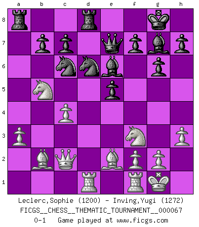Last move : 0-1 2009 February 3 6:34:23 [Event "FICGS__CHESS__THEMATIC_TOURNAMENT__000067"] [Site "FICGS"] [Date "2008.12.04"] [Round "1"] [White "Leclerc,Sophie"] [Black "Inving,Yugi"] [Result "0-1"] [WhiteElo "1200"] [BlackElo "1272"] 1.b4 a6 2.a3 d6 3.Bb2 Nf6 4.Nc3 g6 5.d4 Bg7 6.Nf3 O-O 7.e4 Bg4 8.Be2 Nc6 9.O-O e5 10.dxe5 dxe5 11.h3 Be6 12.Ng5 Bd7 13.Nf3 Be6 14.b5 axb5 15.Nxb5 Qe7 16.c4 Nxe4 17.Qc2 Nd6 18.Rad1 Rfd8 0-1 Polish (Sokolsky) opening Kingside Castling by player Black (move 6) Kingside Castling by player White (move 9) Player Black won this chess game. Follow this game move after move (download)Combinations have always been the most intriguing aspect of Chess. The masters look for them, the public applauds them, the critics praise them. It is because combinations are possible that Chess is more than a lifeless mathematical exercise. They are the poetry of the game; they are to Chess what melody is to music. They represent the triumph of mind over matter. (Reuben Fine) Im Hotelzimmer gab es nur zwei Schaben. (Über die Turnierbedingungen) (Peter Swidler) Cuando la partida de Ajedrez termina, el Peón y el Rey regresan a la misma caja. (Irish saying) Les Echecs ne sont pas pour les âmes timides. Ils requièrent un homme entier, qui ne s'arrête pas aveuglément à ce qui a été déjà établi, mais qui tente individuellement de sonder les profondeurs du jeu. (W. Steinitz) At work, the authority of a person is inversely proportional to the number of pens that person is carrying. (Dan Rotaru)