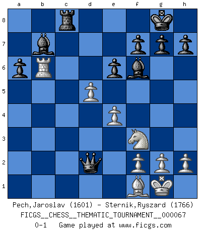 Last move : 0-1 2009 May 10 16:31:39 [Event "FICGS__CHESS__THEMATIC_TOURNAMENT__000067"] [Site "FICGS"] [Date "2008.12.04"] [Round "1"] [White "Pech,Jaroslav"] [Black "Sternik,Ryszard"] [Result "0-1"] [WhiteElo "1601"] [BlackElo "1766"] 1.b4 d5 2.Bb2 Nf6 3.Nf3 e6 4.a3 c5 5.bxc5 Bxc5 6.e3 O-O 7.c4 b6 8.d4 Bd6 9.Nc3 Bb7 10.Rc1 Nbd7 11.cxd5 Nxd5 12.Nb5 Be7 13.Bd3 N7f6 14.O-O a6 15.Nc3 Nxc3 16.Rxc3 Qd5 17.Re1 Rfc8 18.e4 Qa5 19.Qd2 Rxc3 20.Bxc3 Qxa3 21.Ra1 Qb3 22.d5 Rc8 23.Bxf6 Bxf6 24.Rb1 Qa3 25.Rxb6 Qc1+ 26.Bf1 Qxd2 0-1 This chess game has been lost on time (started : 2008.12.04 18:41:59) Polish (Sokolsky) opening Kingside Castling by player Black (move 6) Kingside Castling by player White (move 14) Player Black won this chess game. Follow this game move after move (download)It was clear to me that the vulnerable point of the American Grandmaster (Bobby Fischer) was in double-edged, hanging, irrational positions, where he often failed to find a win even in a won position. (Efim Geller) Kritik überlasse ich den Spießern. Ich zeige nichts, wofür ich mich schämen muss. (Alexandra Kosteniuk) De eso se trata el Ajedrez. Un día le das una lección a tu oponente y al día siguiente el te da una a tí. (Bobby Fischer) Aux échecs, les retours au sommet sont rares : les dommages psychologiques consécutifs à une défaite sont trop sévères. (Daily Telegraph) Life is like a play: it's not the length but the excellence of the acting that matters. (Seneca)