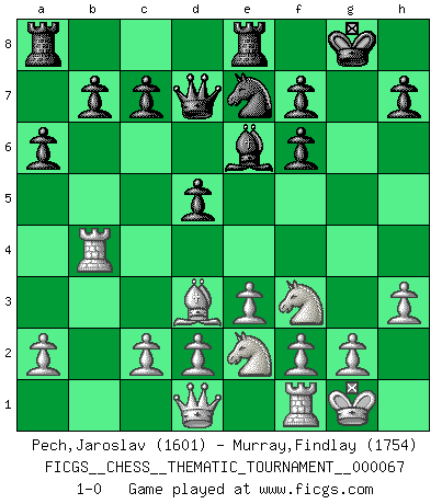 Last move : 1-0 2009 March 6 22:37:10 [Event "FICGS__CHESS__THEMATIC_TOURNAMENT__000067"] [Site "FICGS"] [Date "2008.12.04"] [Round "1"] [White "Pech,Jaroslav"] [Black "Murray,Findlay"] [Result "1-0"] [WhiteElo "1601"] [BlackElo "1754"] 1.b4 e5 2.Bb2 Bxb4 3.Bxe5 Nf6 4.Nf3 Nc6 5.Bb2 d5 6.e3 O-O 7.Bd3 Bg4 8.h3 Be6 9.Nc3 Re8 10.O-O Qd7 11.Rb1 Ne7 12.Ne2 a6 13.Bxf6 gxf6 14.Rxb4 1-0 Polish (Sokolsky) opening Kingside Castling by player Black (move 6) Kingside Castling by player White (move 10) Player White won this chess game. Follow this game move after move (download)The Chess pieces are the block alphabet which shapes thoughts; and these thoughts, although making a visual design on the chessboard, express their beauty abstractly, like a poem. (Marcel Duchamp) Er war ein guter Schachspieler, aber ich kann Leute nicht ausstehen, die 'Heil Hitler' rufen (Über Alexander Aljechin). (Miguel Najdorf) El Ajedrez es 99 por ciento táctica. (Teichmann) Pour se monter efficace, un Cavalier a besoin d'avant-postes ! Les Cavaliers font les meilleurs bloqueurs de pions passés. A good player is always lucky. (Capablanca)