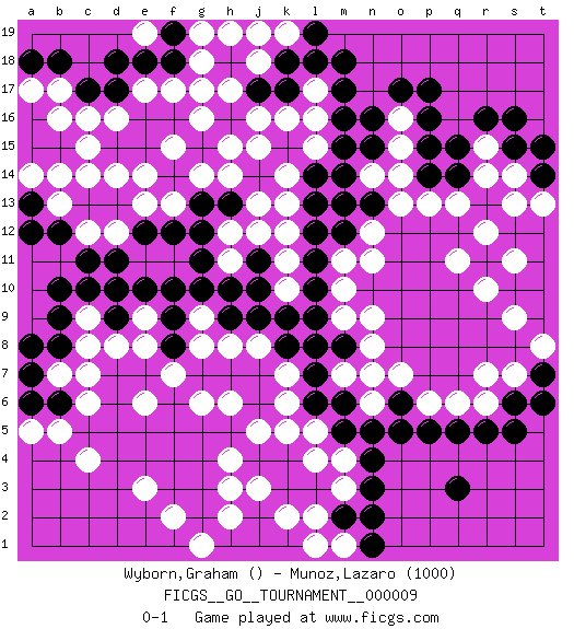 Last move : 0-1 2007 May 8 7:15:42 [Event "FICGS__GO__TOURNAMENT__000009"] [Site "FICGS"] [Date "2006.08.21"] [Round "1"] [Black "Wyborn,Graham"] [White "Munoz,Lazaro"] [Result "0-1"] [Rating 2 "1000"] 1.r16 d16 2.q3 c4 3.p17 e3 4.c10 c8 5.k3 r10 6.r11 q11 7.r5 r12 8.n4 r7 9.j17 c12 10.e10 g17 11.m17 h3 12.e12 d14 13.g11 g14 14.j11 e8 15.c11 d12 16.d11 r14 17.c17 c16 18.j14 o14 19.s15 s14 20.m14 n11 21.j2 h2 22.s6 s7 23.m12 n12 24.l10 n9 25.l8 n7 26.m6 n6 27.p5 q6 28.q5 h6 29.g7 g6 30.h7 f7 31.f8 e6 32.b9 k7 33.d17 e17 34.e16 f17 35.e18 b17 36.f16 g16 37.g15 h15 38.f14 f15 39.d15 c15 40.j7 k6 41.g13 h14 42.h13 f13 43.f12 e13 44.j6 j5 45.k8 m7 46.l7 k5 47.l6 g8 48.f9 j8 49.e15 e14 50.f18 g18 51.h18 g19 52.a6 b7 53.b6 c6 54.a7 b5 55.b8 c7 56.j4 h4 57.h1 g1 58.j1 f2 59.l3 j3 60.j9 h8 61.h9 k2 62.k1 l1 63.m5 m3 64.k4 l5 65.n3 l4 66.m2 l2 67.n1 c9 68.b10 g9 69.g10 j15 70.k15 o16 71.o17 k16 72.k17 k14 73.n16 j13 74.l14 l15 75.m15 l17 76.l18 l16 77.b18 e19 78.d18 b16 79.f19 a5 80.a8 h17 81.a18 j18 82.b12 b13 83.a13 b14 84.k18 h19 85.j19 k19 86.t14 t13 87.t15 s11 88.p15 o15 89.n13 o13 90.p14 p13 91.q14 q13 92.p16 m11 93.l12 h12 94.g12 j12 95.t7 t8 96.t6 s9 97.l11 j16 98.m18 a14 99.a12 m4 100.n5 m1 101.n2 e9 102.f10 n14 103.m13 r6 104.s5 h11 105.h10 r15 106.s16 k11 107.j10 k12 108.m16 k10 109.k9 m9 110.l9 p6 111.o6 o7 112.o5 m10 113.q15 s13 114.l19 j19 115.d9 d8 116.d10 a17 117.l13 k13 118.m8 n8 119.n15 c14 0-1 Here are the names of the openings (joseki) played in the four corners : Corner d16 : d16 j17 Hoshi (Hwajeom, Seongjeom, Xingwei`) 4-4 Point. The star or hoshi (4-4) point, emphasizing influence at the potential expense of territory. Player White won this Go (weiqi, baduk) game. Follow this game move after move (download)Learn to play under the stones. (Anonymous) Pretend inferiority and encourage his arrogance. (Sun Tzu)