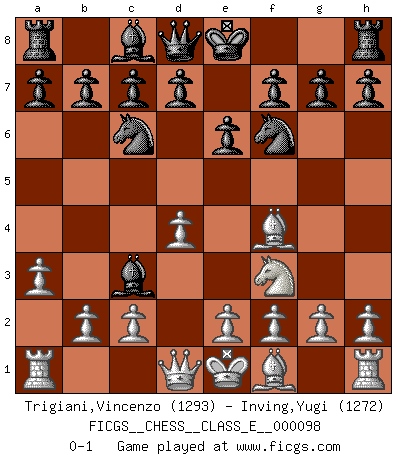 Last move : 0-1 2009 February 6 20:40:20 [Event "FICGS__CHESS__CLASS_E__000098"] [Site "FICGS"] [Date "2008.12.06"] [Round "1"] [White "Trigiani,Vincenzo"] [Black "Inving,Yugi"] [Result "0-1"] [WhiteElo "1293"] [BlackElo "1272"] 1.d4 e6 2.Bf4 Nc6 3.Nc3 Bb4 4.Nf3 Nf6 5.a3 Bxc3+ 0-1 This chess game has been lost on time (started : 2008.12.06 22:12:4) Queen's pawn Player Black won this chess game. Follow this game move after move (download)If you aren't afraid of Spassky, then I have removed the element of money. (Jim Slater) Im Schach nämlich geht es darum, daß Ich des Gegners klein zu kriegen, sein Ego zu zerbrechen und zu zermahlen, seine Selbstachtung zu zertreten und zu verscharren und seine ganze mißachtenswerte sogenannte Persönlichkeit ein für alle Mal tot zu hacken und zu zerstampfen und dadurch die menschliche Gesellschaft von einer stinkenden Pestbeule zu befreien. Es ist ein königliches Spiel. (Robert James Fischer) Siempre es mucho mejor sacrificar las piezas de tu oponente. (Savielly Tartakover) Je fais ceci parce que dans cinquante coups j'obtiendrai cela; je m'appelle Mikhail Moisevitch Botvinnik. (Botvinnik) Whoever said the pen is mightier than the sword obviously never encountered automatic weapons. (US General Douglas MacArthur)