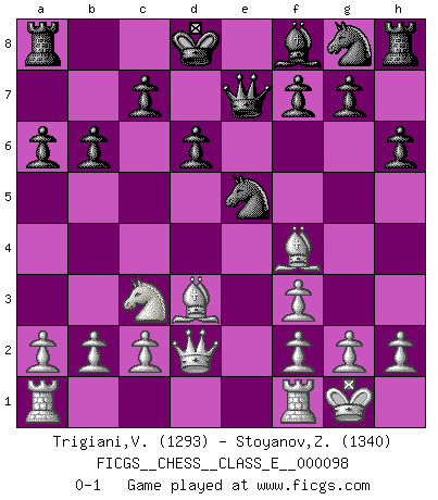 Last move : 0-1 2009 February 28 21:55:1 [Event "FICGS__CHESS__CLASS_E__000098"] [Site "FICGS"] [Date "2008.12.06"] [Round "1"] [White "Trigiani,Vincenzo"] [Black "Stoyanov,Zdravko"] [Result "0-1"] [WhiteElo "1293"] [BlackElo "1340"] 1.d4 d6 2.Bf4 b6 3.Nc3 Bb7 4.Nb5 a6 5.Nc3 h6 6.Nf3 Bxf3 7.exf3 Nd7 8.Bd3 e5 9.dxe5 Qe7 10.O-O Nxe5 11.Qd2 Kd8 0-1 This chess game has been lost on time (started : 2008.12.06 22:12:4) Queen's Pawn Kingside Castling by player White (move 10) Player Black won this chess game. Follow this game move after move (download)A win by an unsound combination, however showy, fills me with artistic horror. (Wilhelm Steinitz) Es ist wirklich schade, dass so viele Schachspieler nicht auf ihr Äußeres achten! (Alexandra Kosteniuk) Cuando tengas duda... ¡juega al Ajedrez!. (Tevis) En blitz, le Cavalier l'emporte sur le Fou. (Vlastimil Hort) CHESS, n. f. [echecs, Fr.] A nice and abstruse game, in which two sets of puppets are moved in opposition to each other. (Dr Samuel Johnson, A Dictionary Of The English Language, 1755)