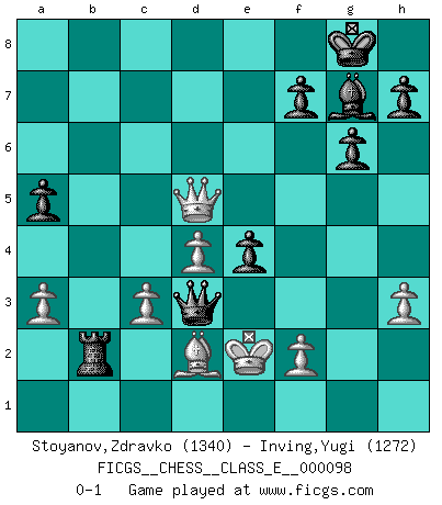 Last move : 0-1 2009 March 4 7:14:13 [Event "FICGS__CHESS__CLASS_E__000098"] [Site "FICGS"] [Date "2008.12.06"] [Round "1"] [White "Stoyanov,Zdravko"] [Black "Inving,Yugi"] [Result "0-1"] [WhiteElo "1340"] [BlackElo "1272"] 1.e4 d6 2.Nf3 Nf6 3.c3 g6 4.h3 Nc6 5.Bb5 Nxe4 6.Bxc6+ bxc6 7.Qa4 Nc5 8.Qxc6+ Bd7 9.Qd5 c6 10.Qc4 Bf5 11.O-O Bg7 12.Ng5 O-O 13.d4 Bd3 14.Qb4 a5 15.Qa3 Bxf1 16.Kxf1 Nd3 17.Nd2 d5 18.Qa4 e5 19.Ngf3 e4 20.Ne1 Nxe1 21.Kxe1 Qd6 22.a3 Rfb8 23.Qc2 Qh2 24.Nb3 Qxg2 25.Be3 Rxb3 26.Qxb3 Qg1+ 27.Kd2 Qxa1 28.Qb7 Re8 29.Qxc6 Qxb2+ 30.Kd1 Qb1+ 31.Ke2 Rb8 32.Qxd5 Rb2+ 33.Bd2 Qd3+ 0-1 King's pawn Opening Kingside Castling by player White (move 11) Kingside Castling by player Black (move 12) Player Black won this chess game. Follow this game move after move (download)Fischer sacrificed virtually everything most of us weakies (to use his term) value, respect, and cherish, for the sake of an artful, often beautiful board game, for the ambivalent privilege of being its greatest master. (Paul Kollar) Ich las kürzlich ein Buch von Nietzsche. Er sagte Religion verdumme nur die Menschen. Ich stimme zu. (Robert James Fischer) Cuando le juegas a Fischer, no es una cuestion de si vas a ganar o perder. Es una cuestion de si vas a sobrevivir. (Boris Spassky) Tous ces prétendus hommes politiques sont les pions, les Cavaliers, les Tours ou les Fous d'une partie d'échecs qui se jouera tant qu'un hasard ne renversera pas l'échiquier. (Honoré de Balzac) If you don't practice you don't deserve to win. (Andre Agassi)